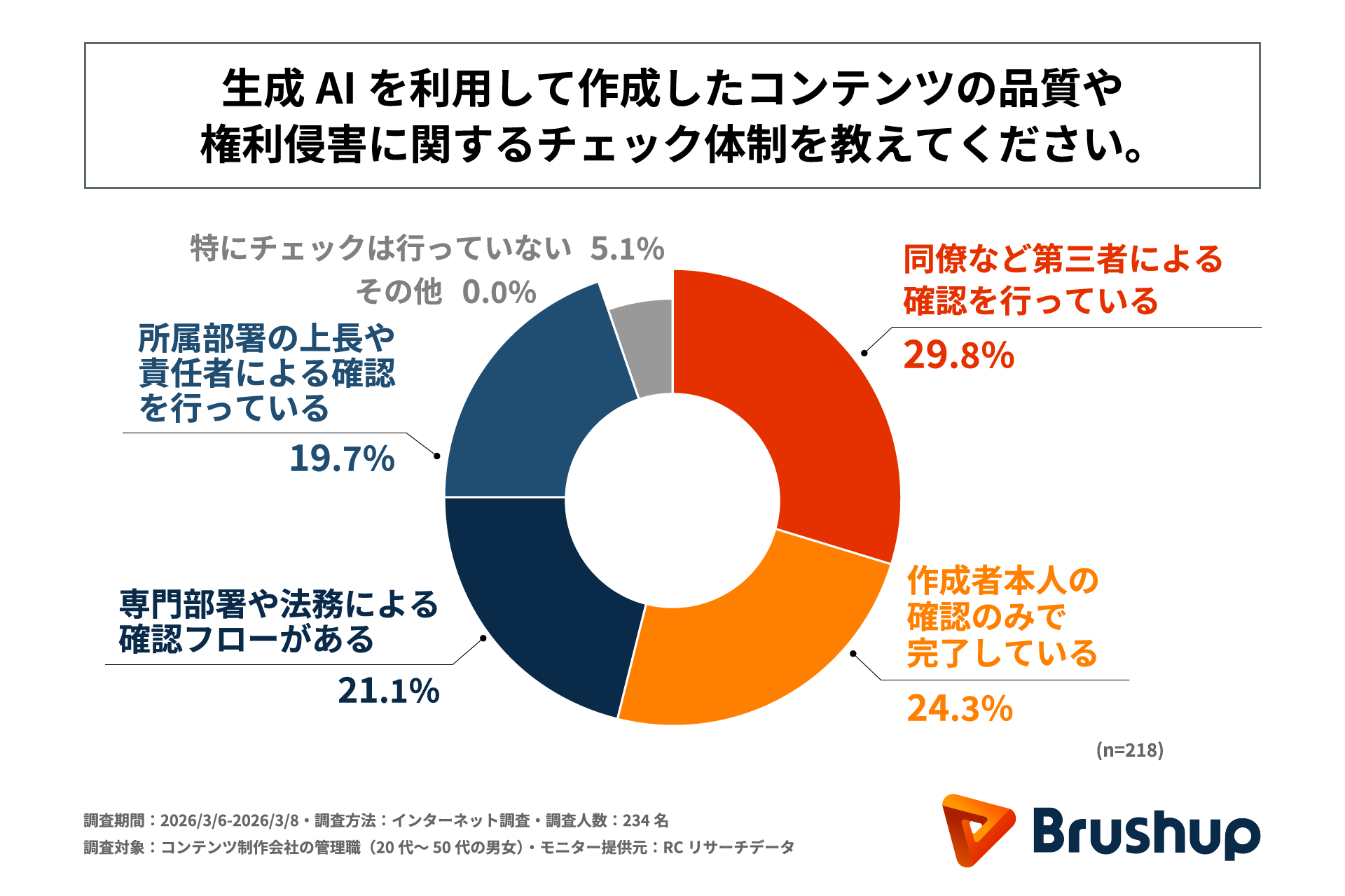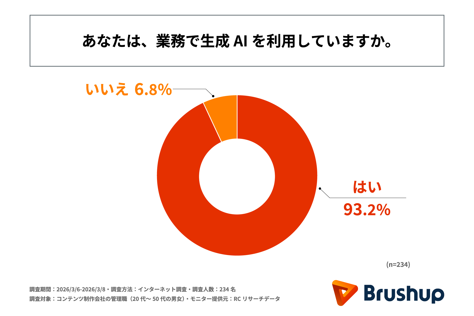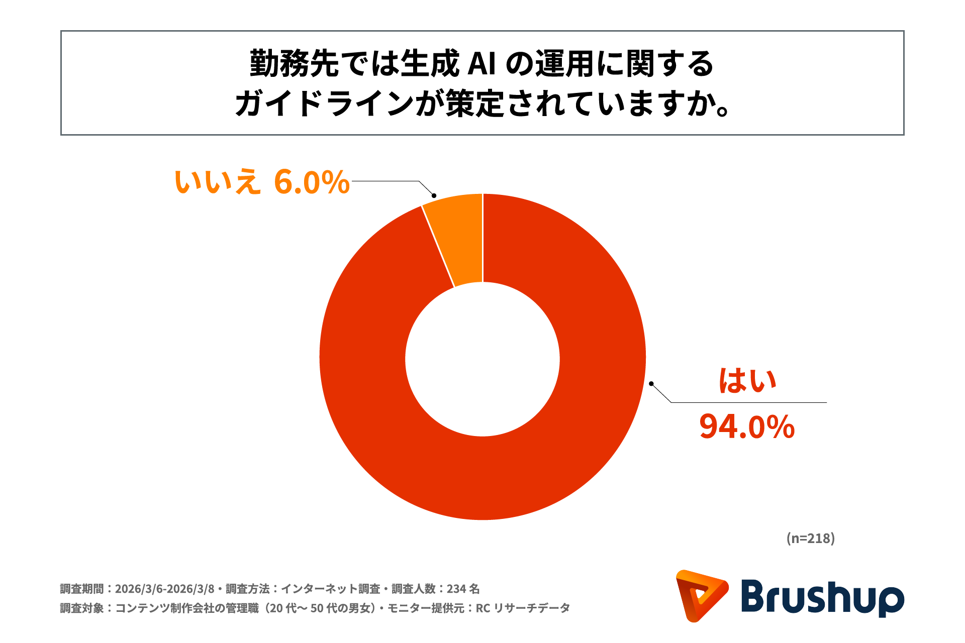 4月からの新年度を機に多くの企業が業務効率化やDX推進の一環としてツールの導入を行うものと思われます。近年、生成AIのビジネス活用が急速に進展していますが、その一方で、著作権や情報漏えいなどのリスク管理が厳格に求められるコンテンツ制作の現場において、運用ルールやチェック体制の整備が追いついていない可能性があります。しかし、現場レベルでAIがどのように利用され、管理されているかという実務実態は明らかになっていません。そこで、株式会社Brushupは、コンテンツ制作会社の管理職を対象に、「コンテンツ制作現場における生成AI運用体制に関する実態調査」を実施しました。