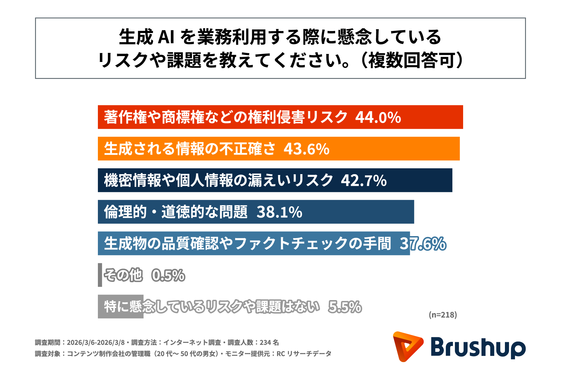 業務で生成AIを利用するコンテンツ制作会社の管理職の約9割が、業務で生成AIを利用することに「リスクを感じている」!Brushupが「コンテンツ制作現場における生成AI運用体制に関する実態調査」を実施