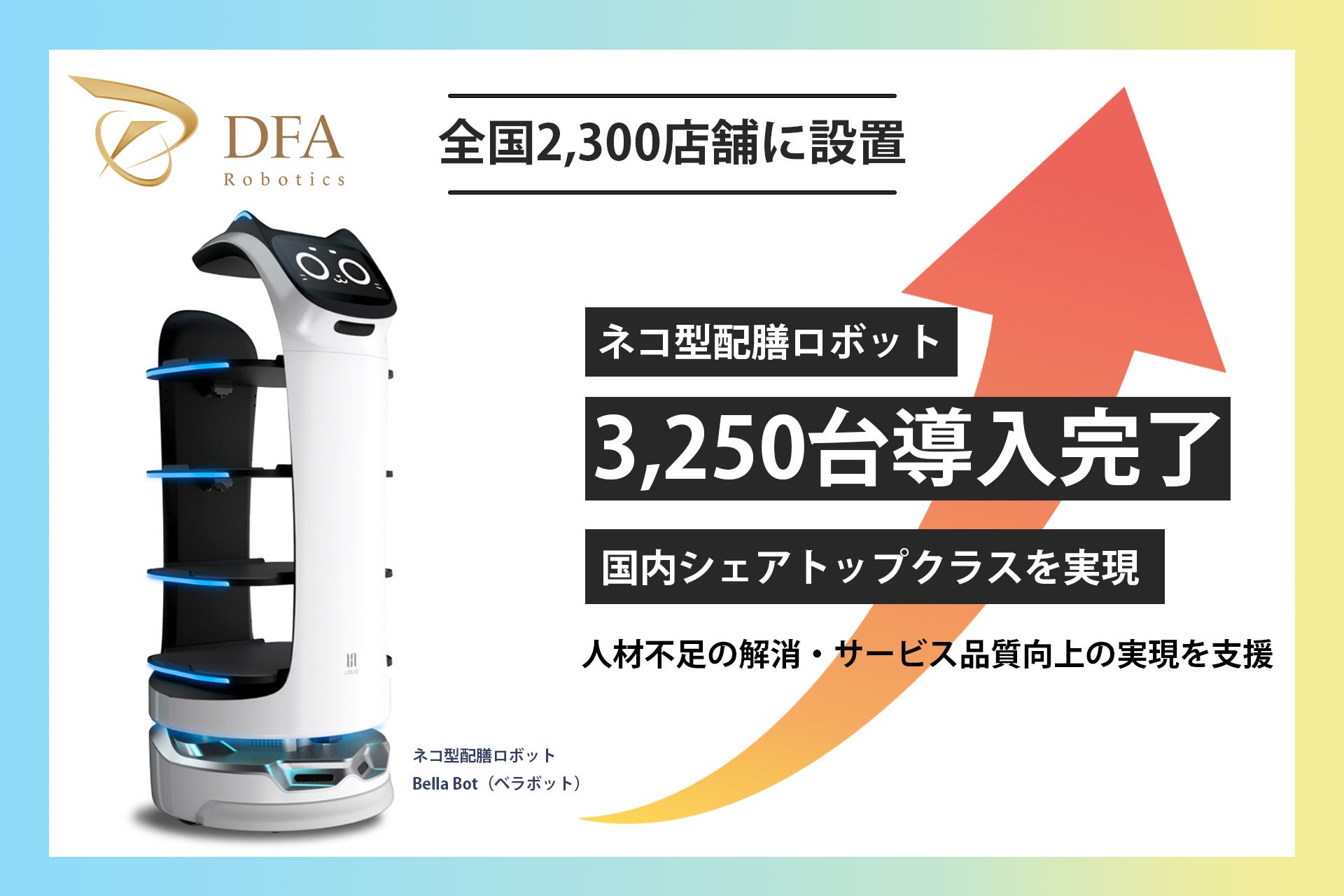 飲食店DXを推進するロボティクスソリューションカンパニーである株式会社DFA Robotics(本社:東京都渋谷区、代表取締役社長:波多野 昌昭)は、提携するPudu Robotics社(本社:中国深セン、日本法人Pudu Robotics Japan 株式会社 代表取締役社長:張涛)が提供するネコ型配膳ロボット「BellaBot(ベラボット)」を、国内大手レストランチェーンを中心とした全国2,300店舗の飲食店へ3,250台導入いたしました。