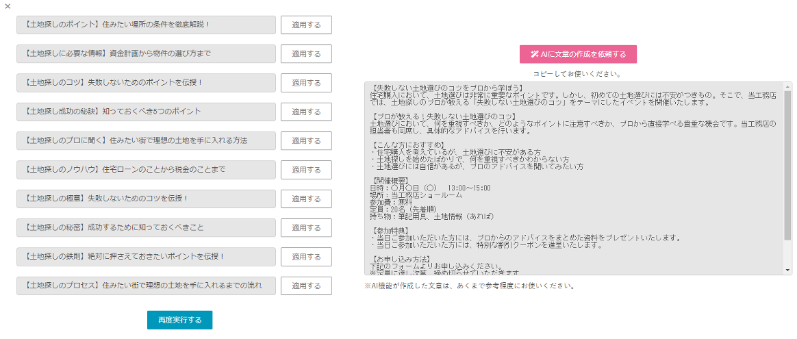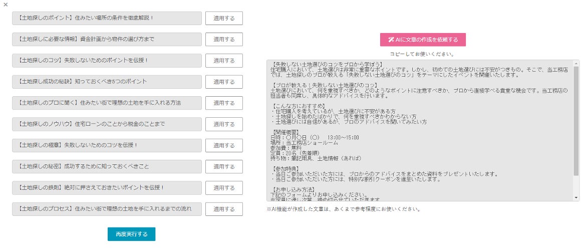 ChatGPT連携を活用してイベントタイトルと本文を作成したサンプルがこちら。キーワードを入力することで10個のタイトル候補が提案、選択したタイトルから750字程度の文章が生成される。