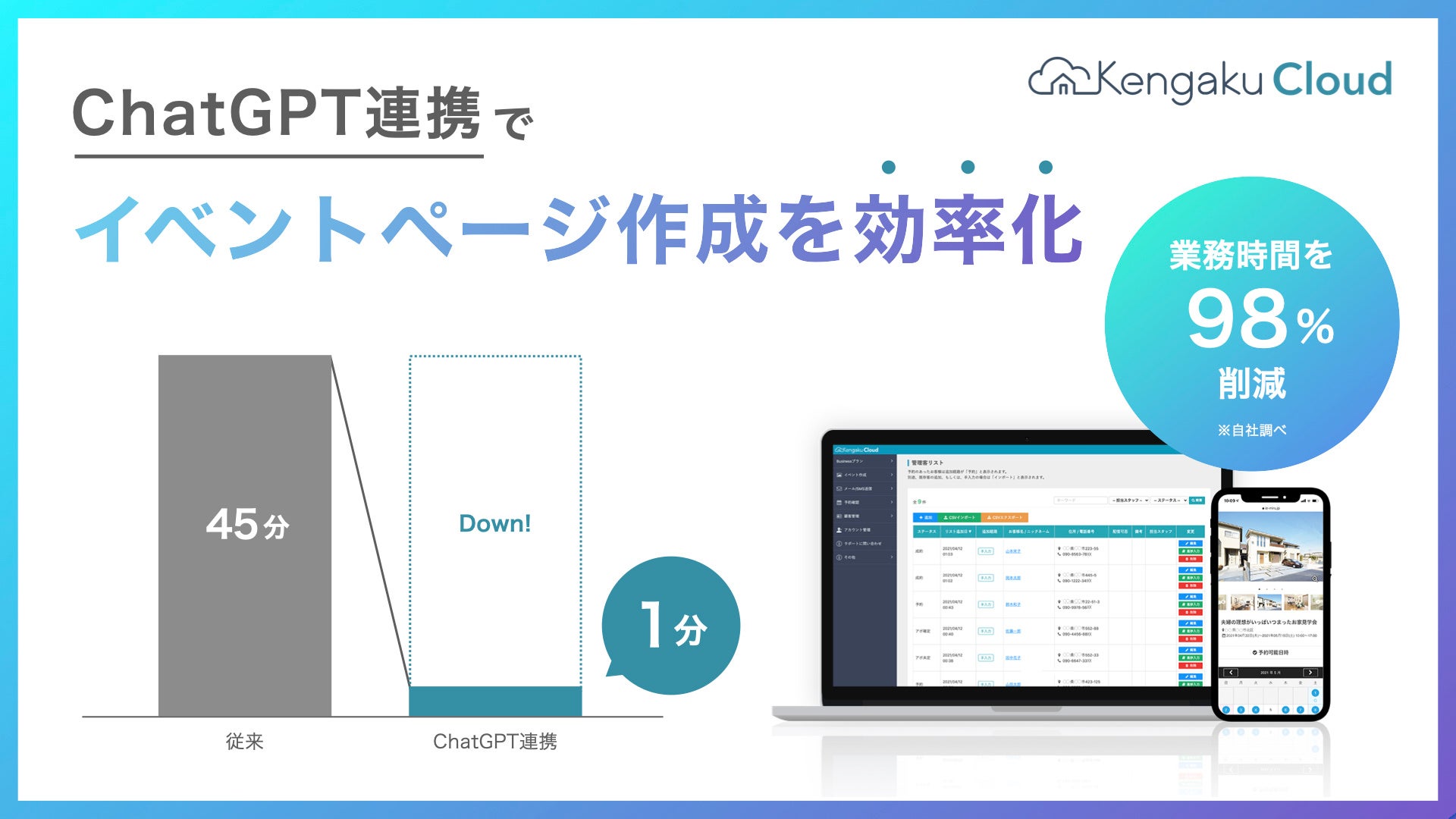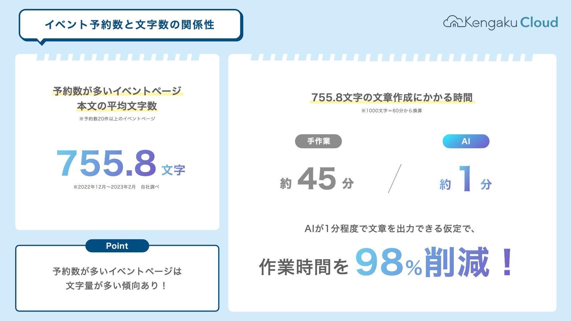 タイトルは数十秒、本文は長くても数分程度で完成。一般的に、1,000字書くために60分程度、プロのライターでも30分程度はかかるとされています。実際に自社で10人の作業時間を計測したところ、755字以上のイベントページを作成するのに平均45分かかったが、ChatGPTの利用によって平均約1分で文章が完成しました。