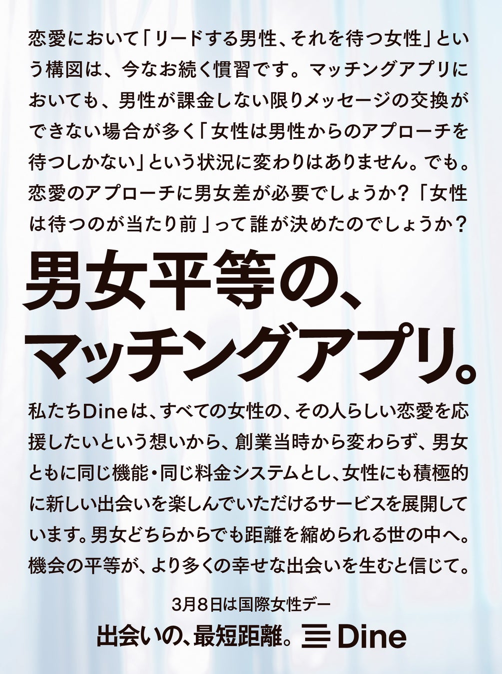 3月8日の国際女性デーに合わせて、Dineが「男女平等の、マッチングアプリ。」と題した意見広告を制作。