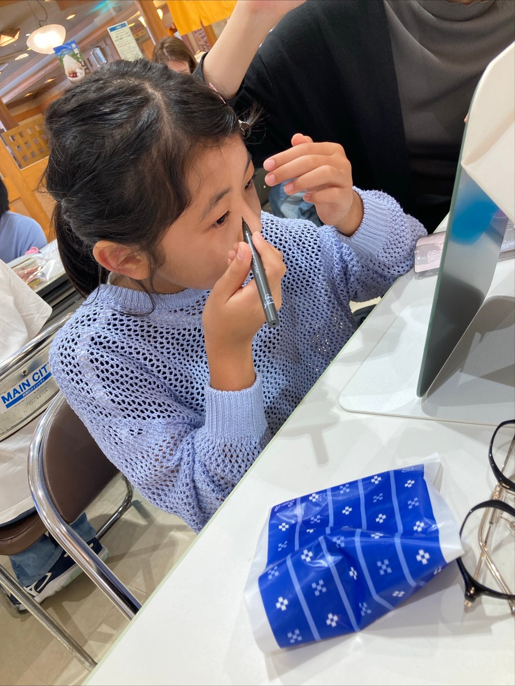 人気のセパレートカールマスカラ「セパレートラッシュ」のグレーブラックを使用。アイライナーと同じニュアンスカラーを使って自然な仕上がりに。初めてマスカラを使う子供たちもドキドキしながら、慎重にマスカラを塗っていきます。