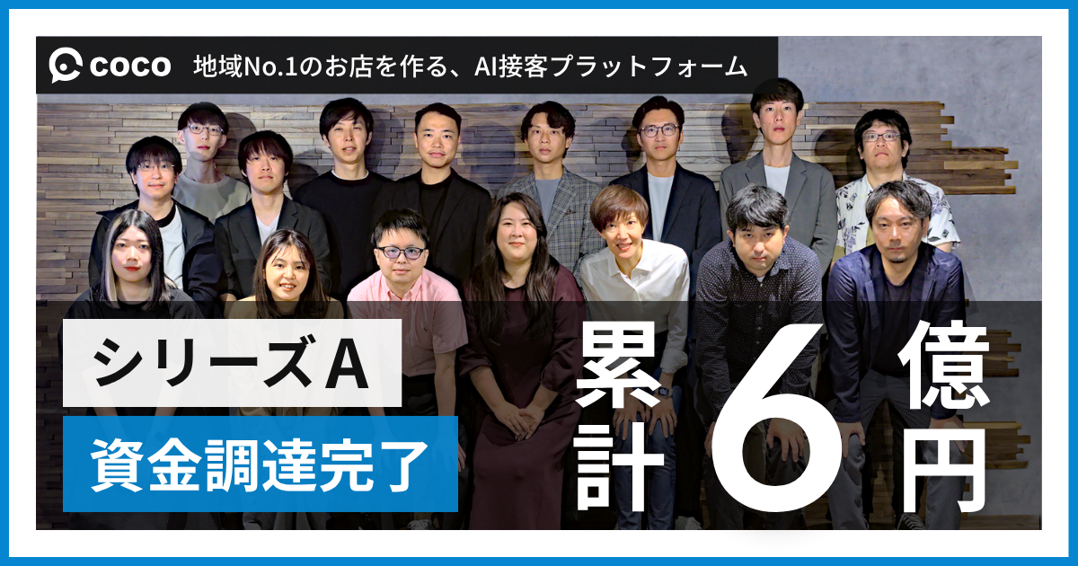 「顧客志向を当たり前に」をミッションに掲げ、店舗向けにAI接客プラットフォーム「coco」を提供する株式会社coco(本社: 東京都渋谷区、代表取締役: 髙橋俊介、以下 coco)は、この度シリーズAラウンドにて総額約3億円の第三者割当増資による資金調達を実施いたしました。これにより、累計6億円超の資金調達が完了したことをお知らせいたします。