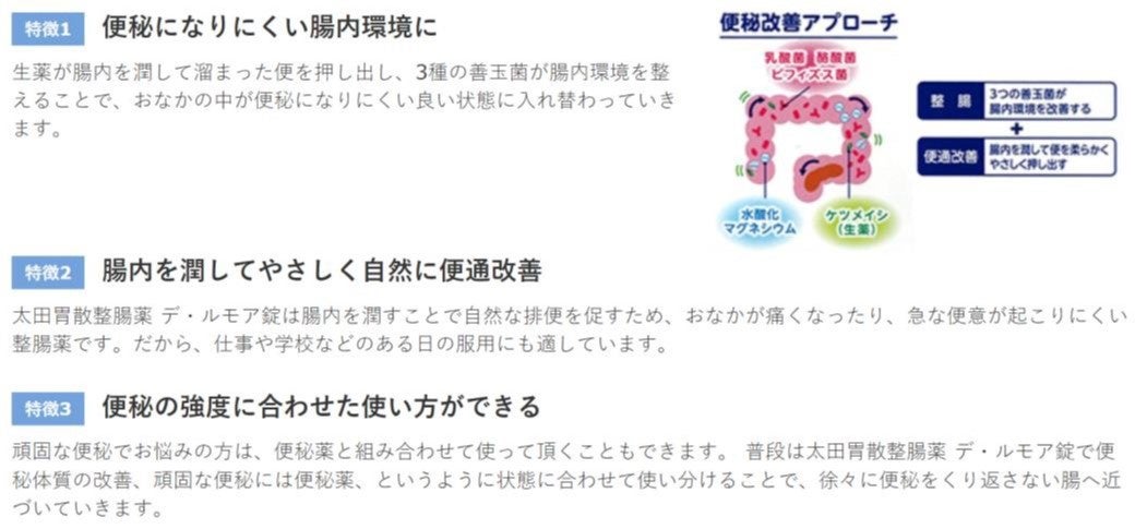 そんなときは、太田胃散整腸薬 デ・ルモア錠。太田胃散整腸薬 デ・ルモア錠は、腸内を潤してスムーズなお通じを促すため、おなかが痛くなったり、急な便意が起こりにくいように処方された整腸薬です。また、3種の善玉菌が腸内環境を整えることで、おなかの中を便秘になりにくい状態にしていきます。