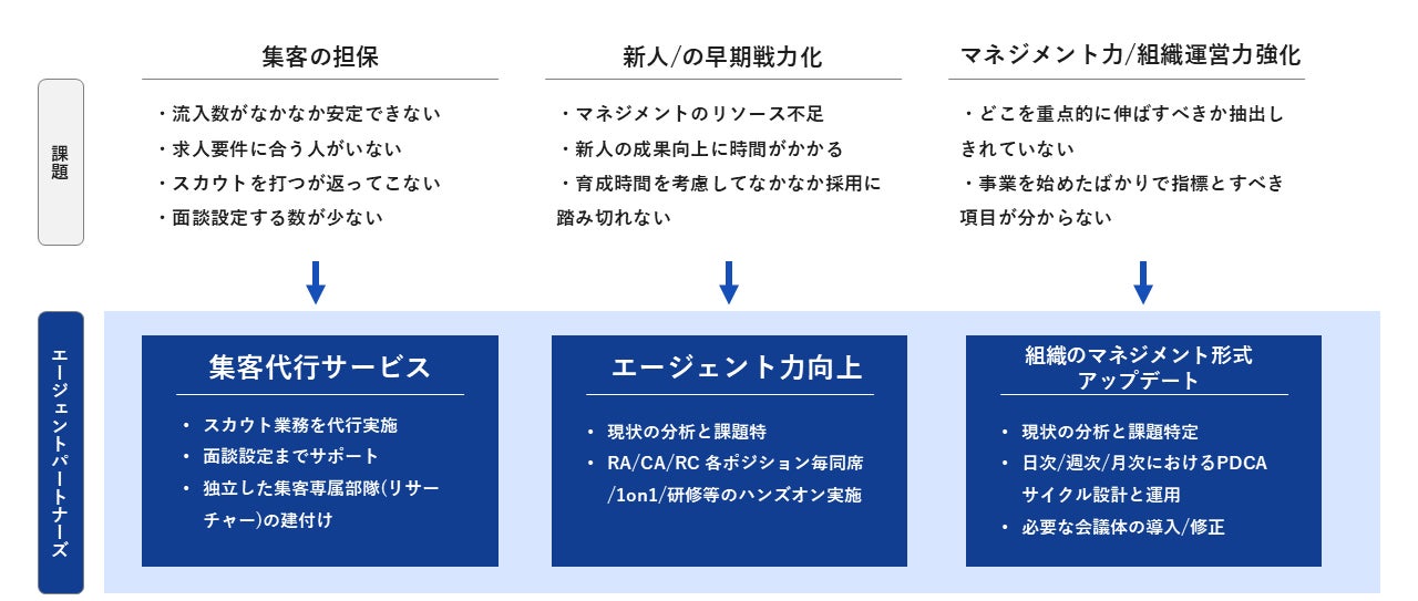「エージェントパートナーズ」には「組織力向上」「集客代行」という2つの強みがあります。