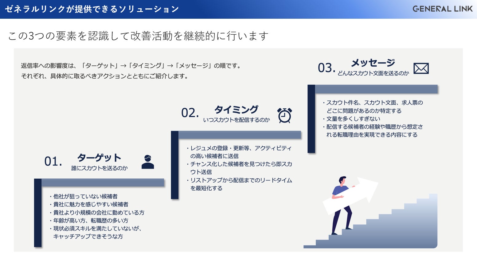 スカウトの返信率に影響を与える要素は「ターゲット:誰にスカウトを送るのか」「タイミング:いつスカウトを配信するのか 」「メッセージ:どんなスカウト⽂⾯を送るのか」の3つです。