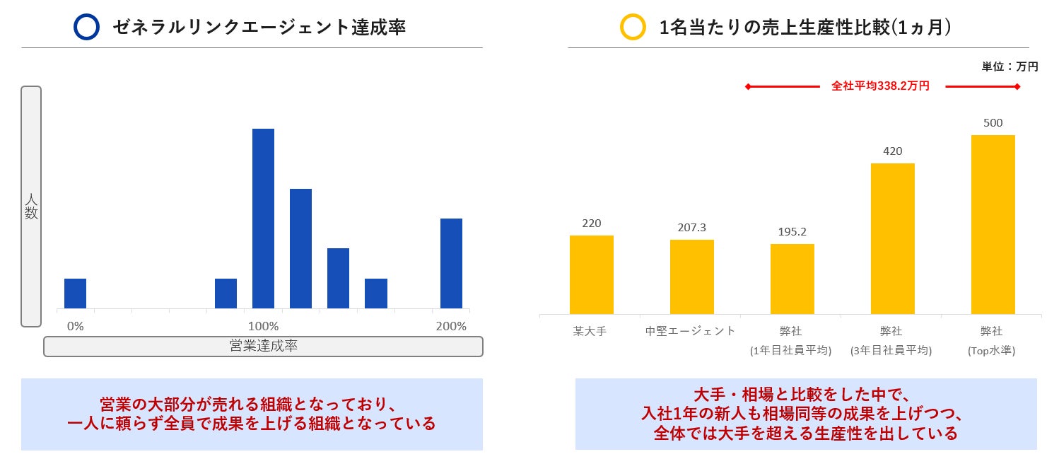 株式会社ゼネラルリンクの人材紹介事業部は、一人当たりの生産性(月間)が他の業界大手企業の約1.7倍と高い水準を維持しており、立ち上げから5年で実績が10倍以上も上昇しています。