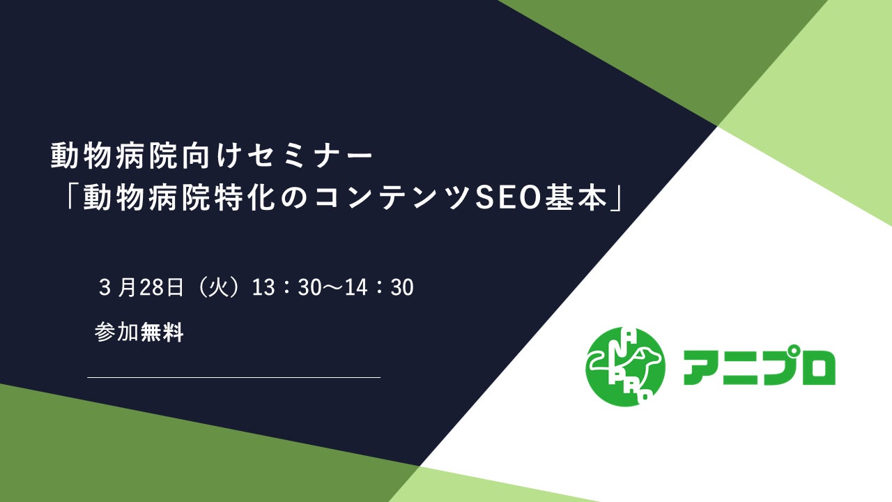 ペットの家族化推進をミッションとし、ペット医療DXをおこなう株式会社TYL(本社:東京都港区 代表取締役:金児 将平、以下TYL)が運営する動物病院向け集患コンサルティングサービス「アニプロ」が、2023年3月28日(火)に「動物病院特化のコンテンツSEO基本」セミナーを開催いたします。
