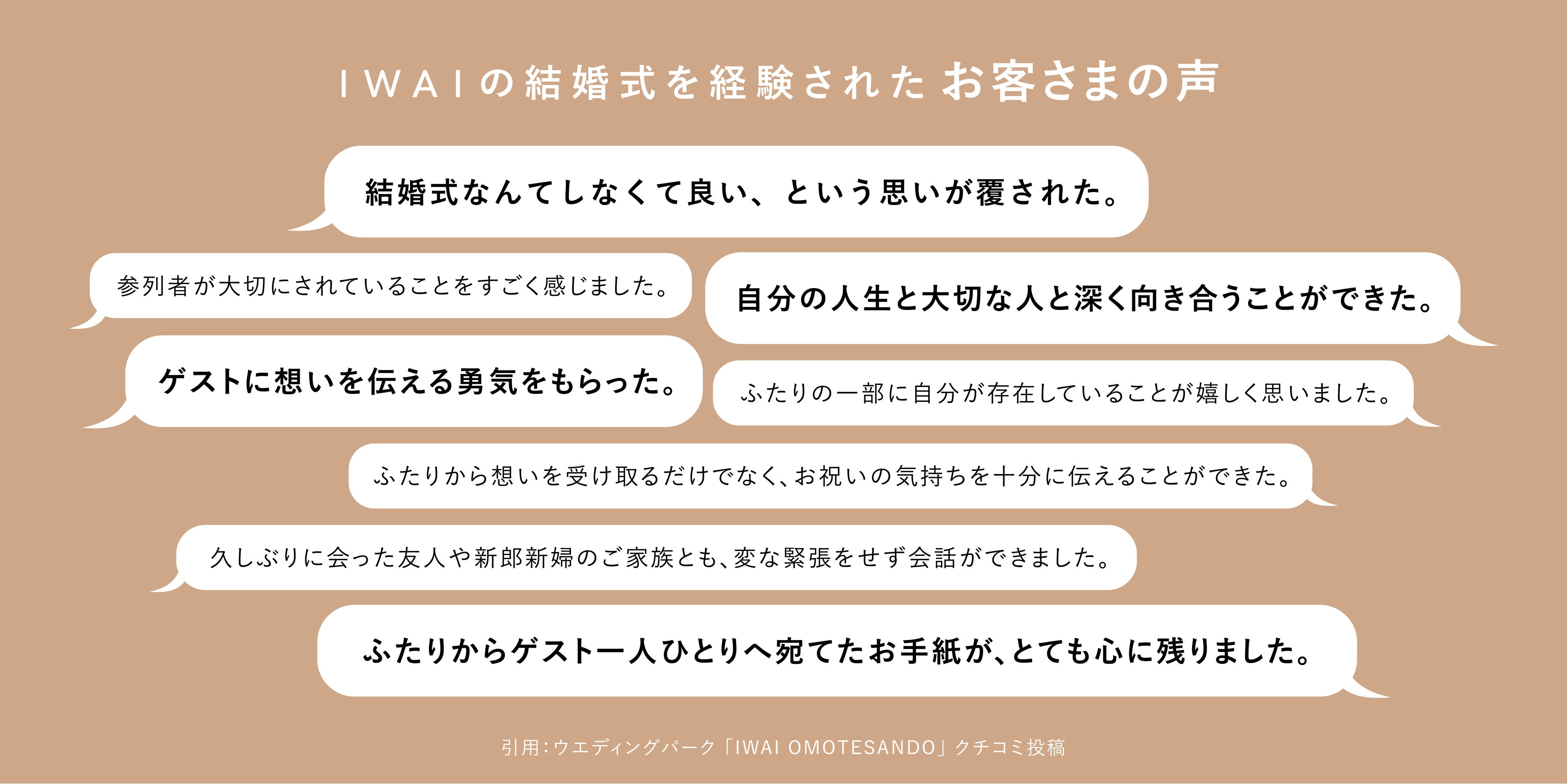 さまざまな結婚式の定番を無くし、人と人が繋がる体験にフォーカスすることで、結婚式を挙げたおふたりやゲストから以下のようなクチコミを約1,000件いただき、今回の受賞に至りました。