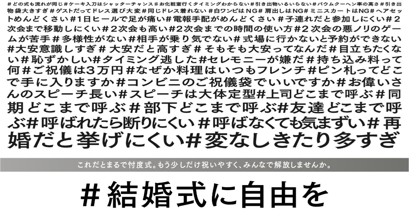 このような状況を踏まえ、IWAI開業直前の2018年11月22日に、「#結婚式に自由を」というキャンペーンを実施し、10,000件を超える結婚式に対する声が集まりました。その結果、Twitter上では、「新郎新婦と話をしたいけれど、ほとんど話せない」「待ち時間が長い」「セレモニーが嫌だ」「恥ずかしい」など結婚式にまつわる本音が見えてきました。