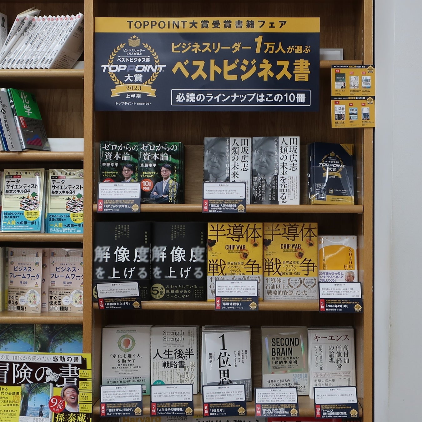 本賞の決定に伴い、丸善ジュンク堂書店、文教堂、有隣堂及び未来屋書店の主要大型店約50店舗にて「TOPPOINT大賞受賞書籍フェア」を開催します。開催期間は、2月1日(日)より1カ月間の予定です。