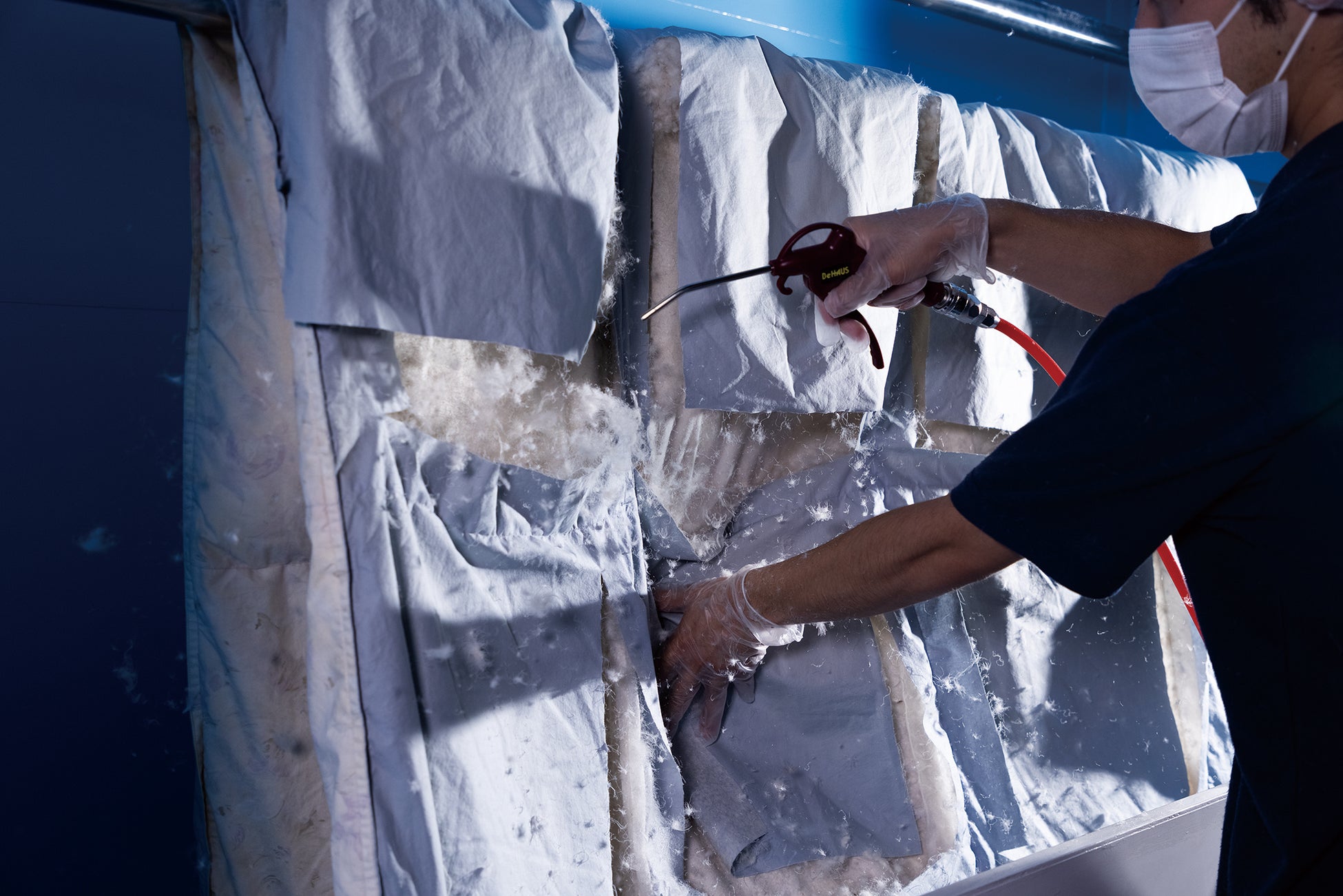 リフォームの工程は、①羽毛ふとんを解体 ②取り出した羽毛の洗浄・除塵・乾燥 ③足し羽毛 ④新しい側地へ充填、最後に異物の混入などがないか確認して出荷します。作業に際しては、ほかの顧客のふとんと混在しないよう、徹底した個別管理の下でお客様の羽毛ふとんを1枚1枚加工いたします。