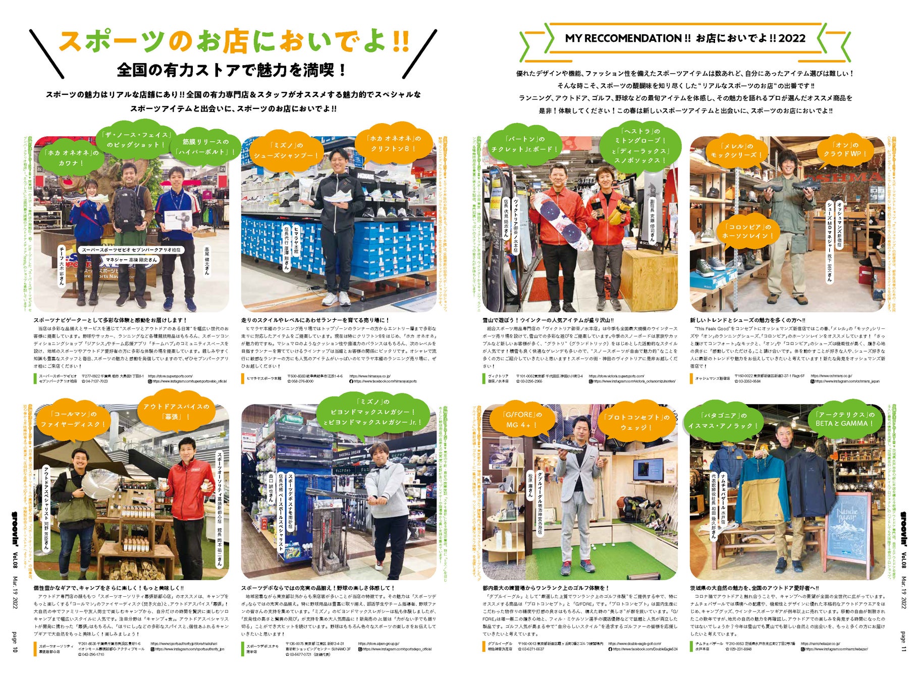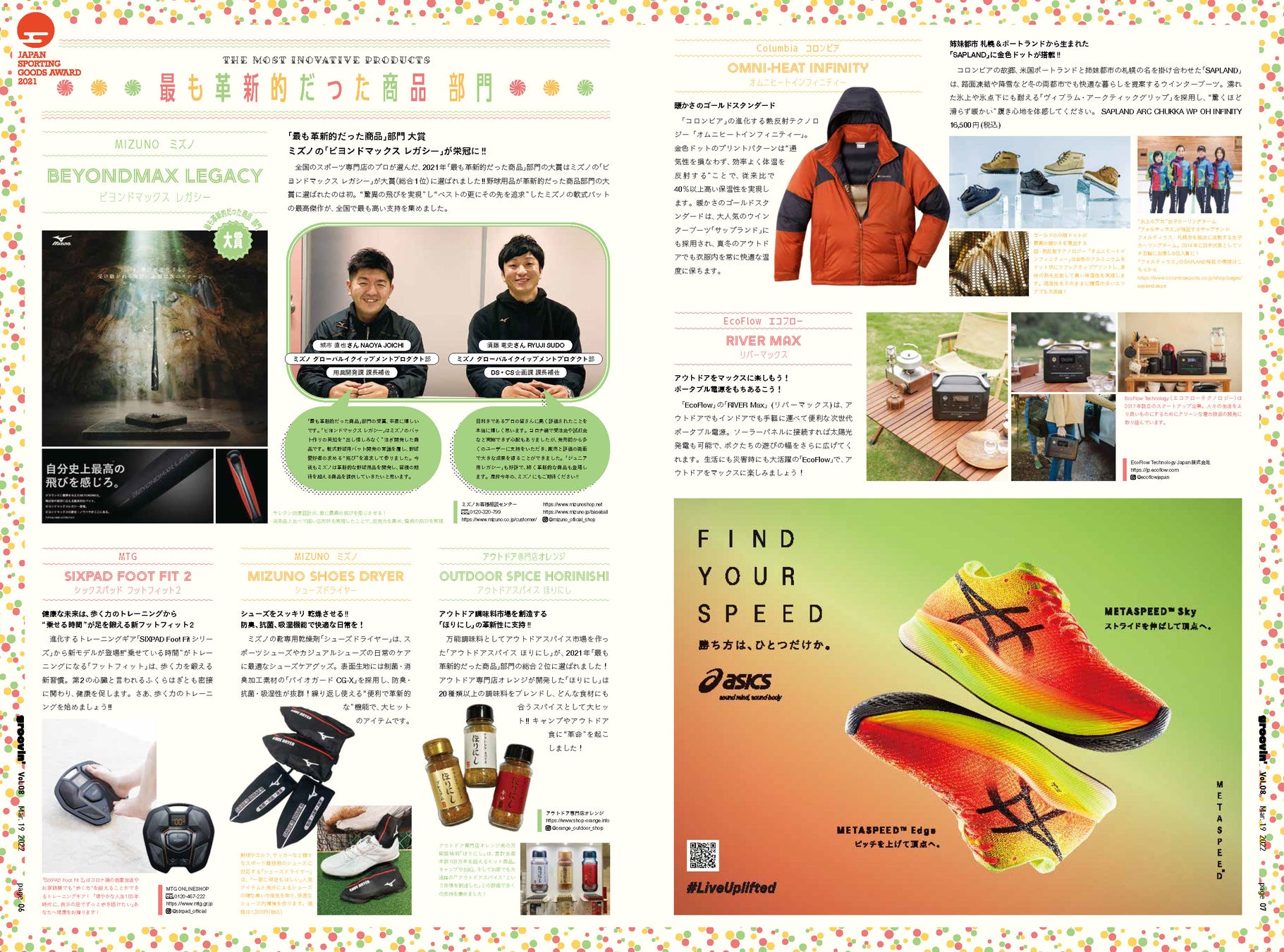 「groovin’」スポーツライフスタイルマガジンは、「スポーツのある暮らし」の魅力をより多くの方にお届けすることを目的にスタートしたタブロイドペーパーです。世界には魅力的なスポーツブランドが数多く存在し、革新的なデザインや技術を背景にした新しいプロダクトが日々生まれています。「groovin’」では全国のスポーツ専門店スタッフが1年のベスト商品を選ぶ「日本スポーツ用品大賞」をはじめ、スポーツを通じた豊かな生活や、各分野で活躍の旬の話題や商品、持続可能性への取り組みを多くの方にお届けしています。