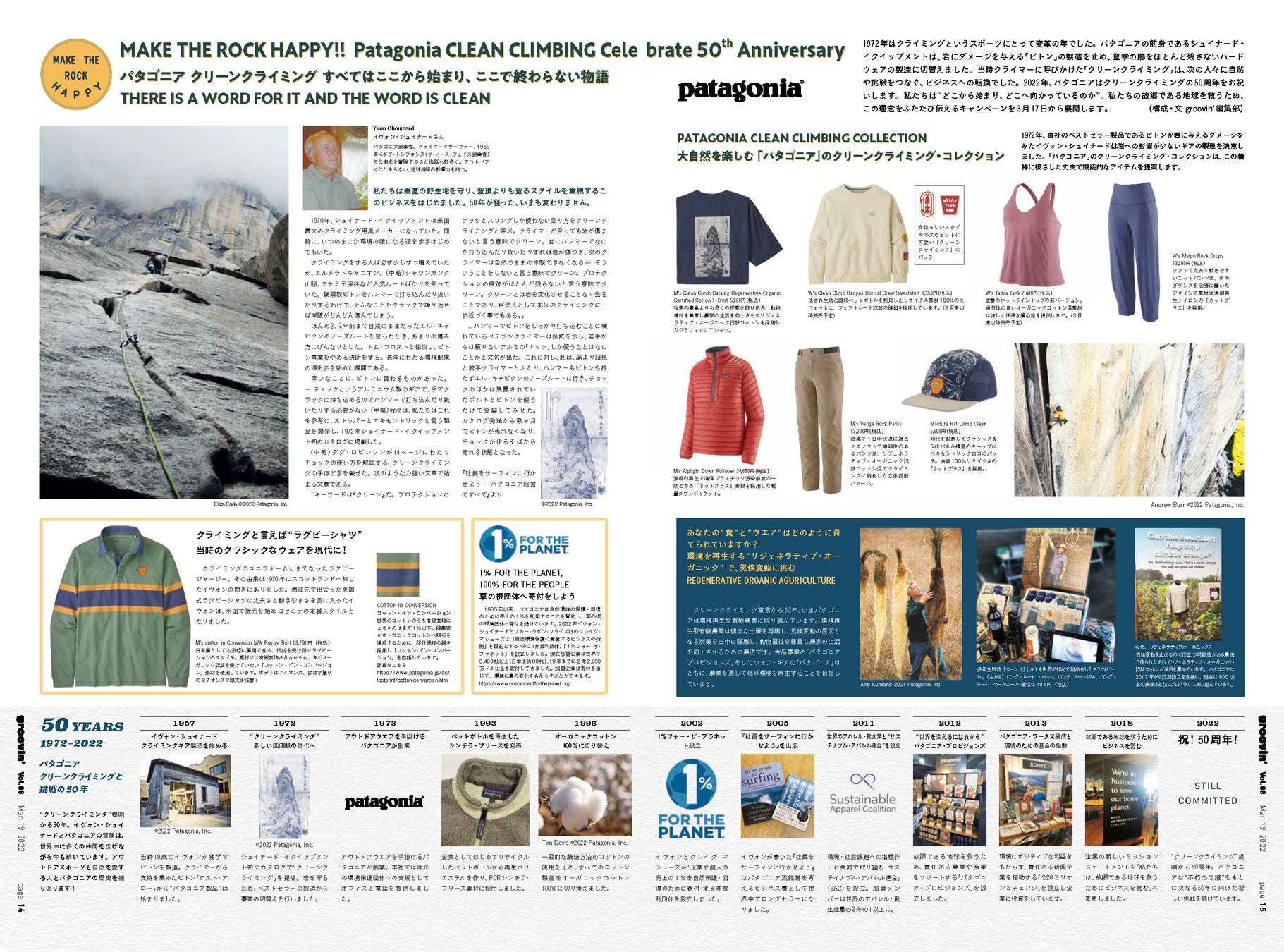 「groovin'」スポーツライフスタイルマガジンは、米国生まれのアウトドアブランド 「パタゴニア」 のクリーンクライミング宣言から50年目のアニバーサリーイヤー特集を掲載しています。大自然を楽しむ「パタゴニア」のクリーンクライミング・コレクションをはじめ、パタゴニア50年の歩みを紹介しています。パタゴニアの魅力的なコレクションを是非ご覧ください!