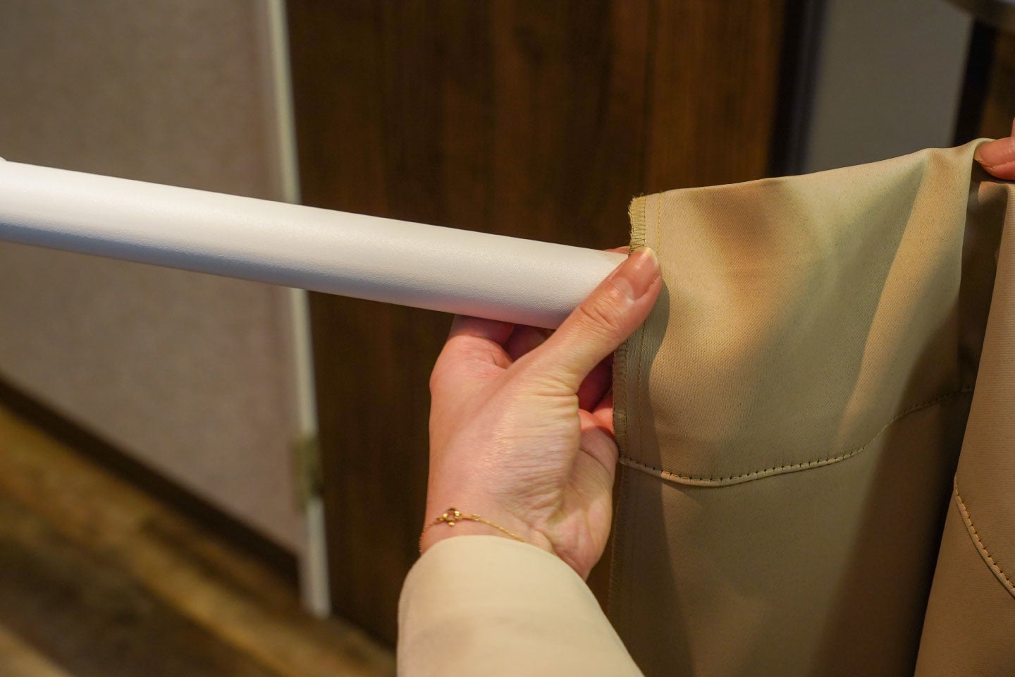 カーテンの上部は10cm程の穴が空いており、そちらにつっぱり棒を通す仕様になっています。市販で販売されているつっぱり棒を利用して設置ができるので、カーテンレール要らずで簡単に取り付けができます。