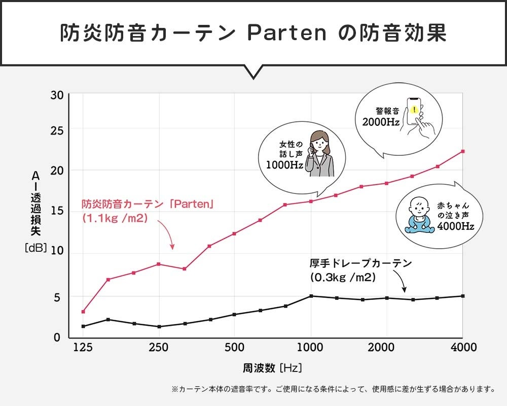 防炎防音カーテン「パーテン(Parten)」は、話し声(特に女性)や警報音などの中高音域の音を5〜10dB程軽減する効果があります。