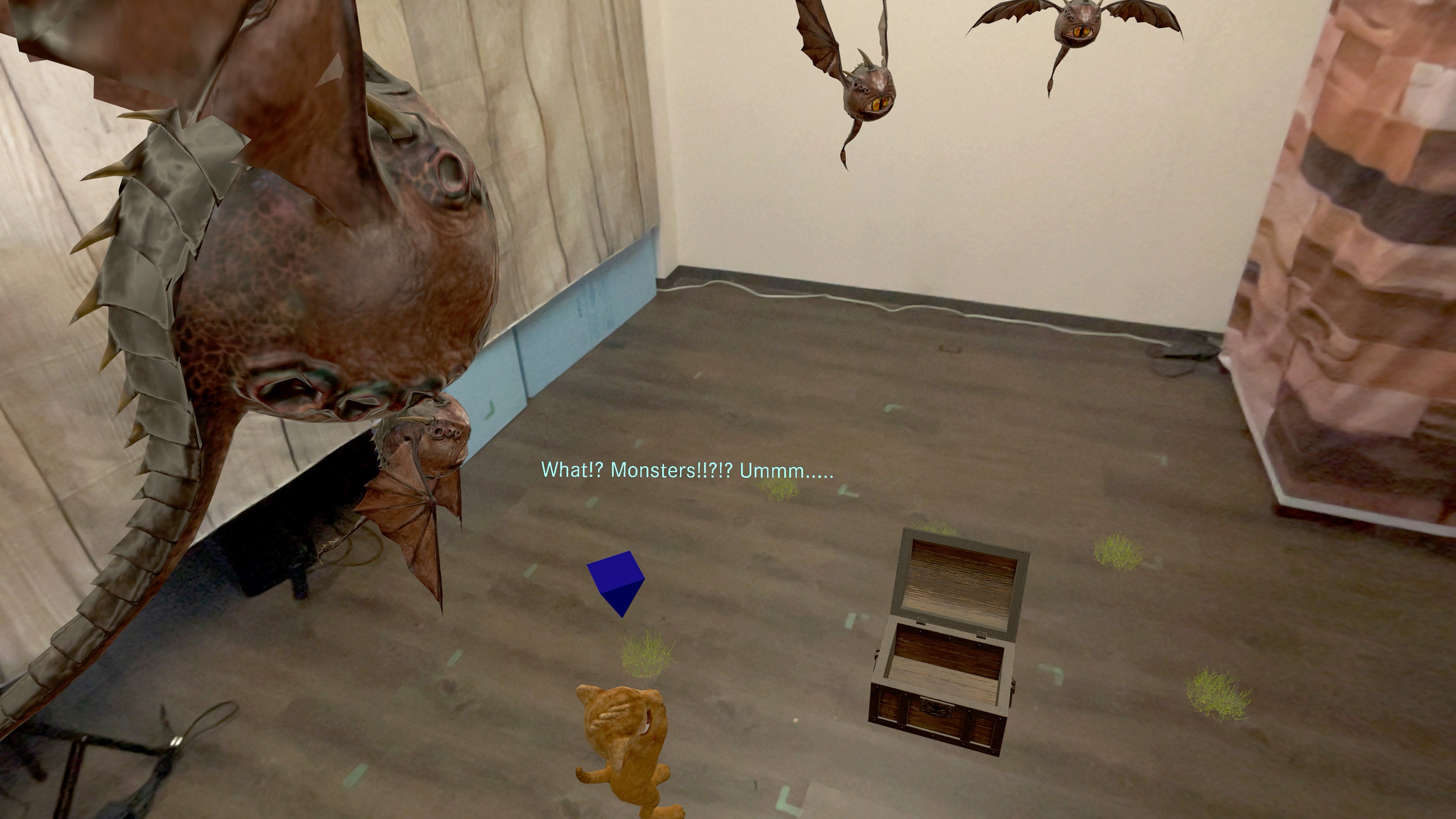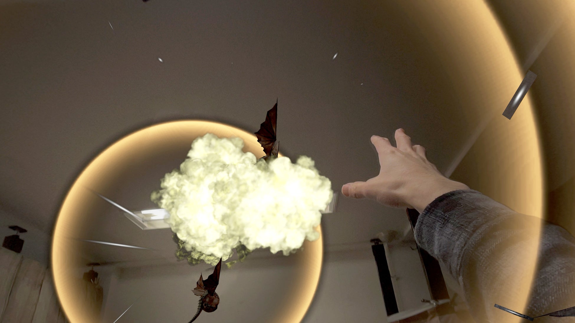 Apple Vision Proのハンドトラッキング機能を生かした、炎の魔法でモンスターと戦うシューティング形式のミニバトル。ファンタジーの登場人物のように手を広げることで炎の魔法を放ってモンスターを攻撃することができます。