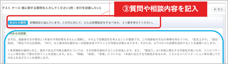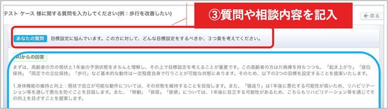 こちらは高齢者の個別的な情報は加味させず、ChatGPTを利用するタイプになります。例えば、記録や申し送り等の文章の作成やチェック、日常業務の管理など、ケアマネジメント業務全般にわたる幅広い質問や相談に対応します。