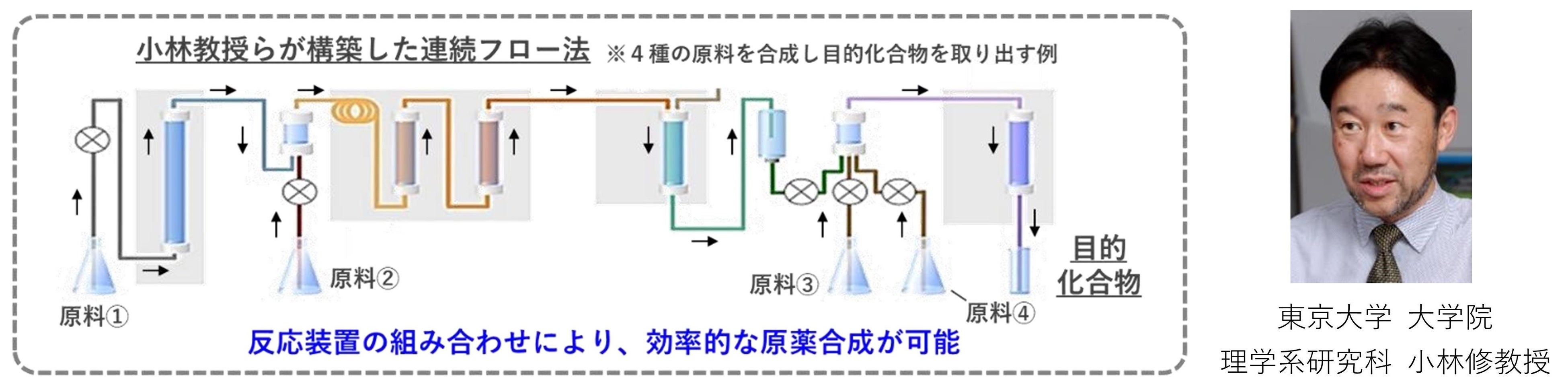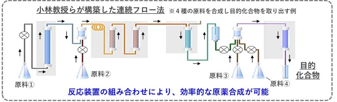 2015年に東京大学 大学院 理学系研究科の小林修教授らの研究グループは、『連続フロー法』を構築し、医薬品有効成分を高収率かつ高選択収率で合成することに成功しました。連続フロー法は、不均一系触媒を用いた反応装置をいくつも連結し個々の反応を組み合わせることで、フロー法の利点を残しつつ複雑な化合物を合成できる手法です(下図)。