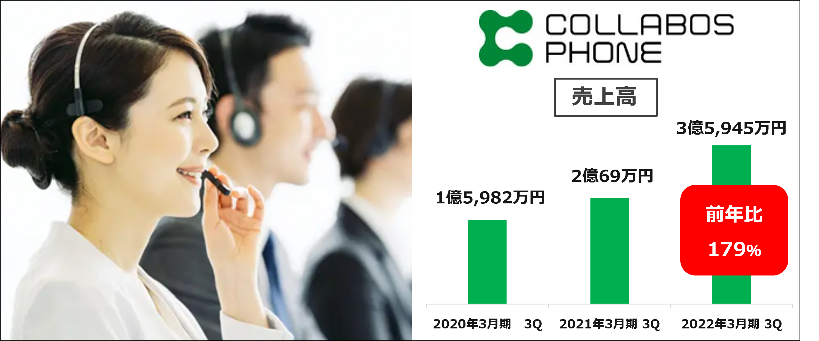 新型コロナウイルス感染予防ワクチン接種等の公共案件の増加や在宅勤務案件の増加により、「COLLABOS PHONE(コラボスフォン)」は、前年比179%の売上高を達成いたしました。