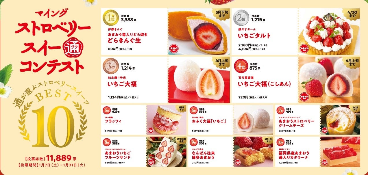 昨年を上回る11,889人の投票を集めた“いちごスイーツ処・マイング”のスイーツコンテスト、1位~10位のいちごスイーツをご紹介いたします。