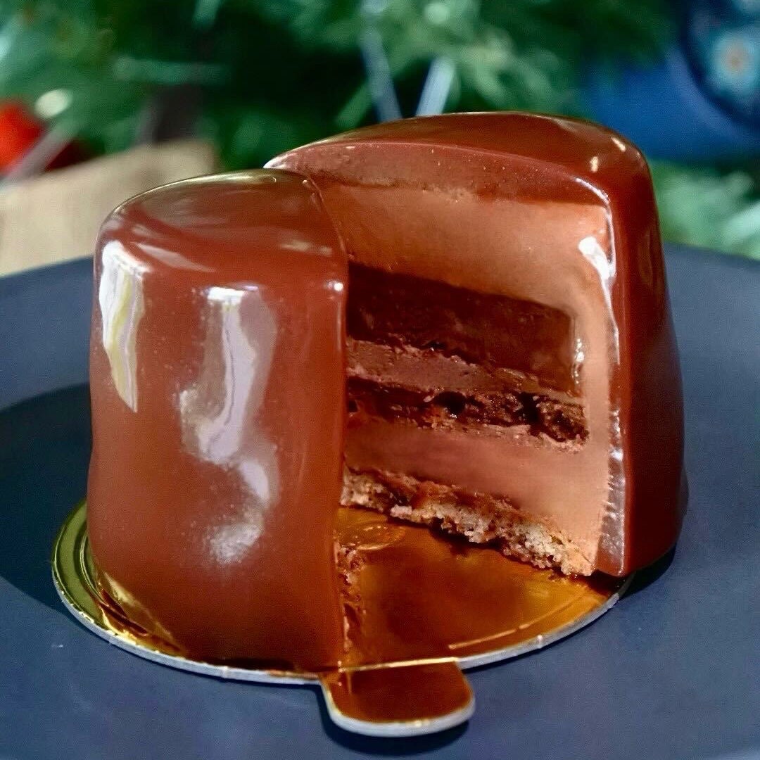 ドミニカ共和国産カカオを使用。カカオニブを混ぜ込んだ軽い食感のカカオニブダックワーズの上に、ザクザクとした舌触りのチョコレートクランチとH₂O CHOCOLATE®︎ガナッシュをのせ、チョコレートムースで包み込み、最後に艶やかで美しいグラサージュを施しました。
