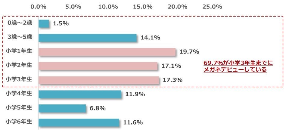 メガネを掛けている小学生の保護者750名を対象に、お子さまがメガネデビューした時期を質問したところ、最多回答は「小学1年生(19.7%)」、次に「小学3年生(17.3%)」、「小学2年生(17.1%)」と続きました。この結果、メガネを掛けている小学生の約7割が、小学3年生までにメガネデビューしていることが分かりました。