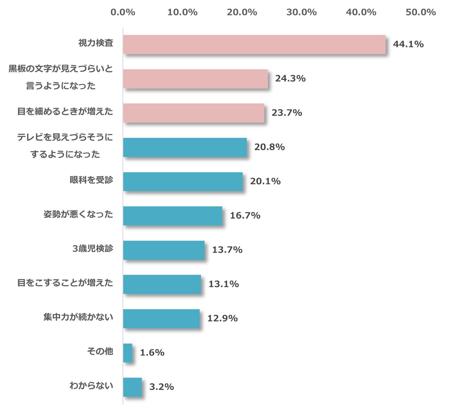 子どもの視力の異変に気付いたきっかけを質問したところ、最多回答は「視力検査(44.1%)」、次に「黒板の文字が見えづらいと言うようになった(24.3%)」、「目を細めるときが増えた(23.7%)」と続きました。