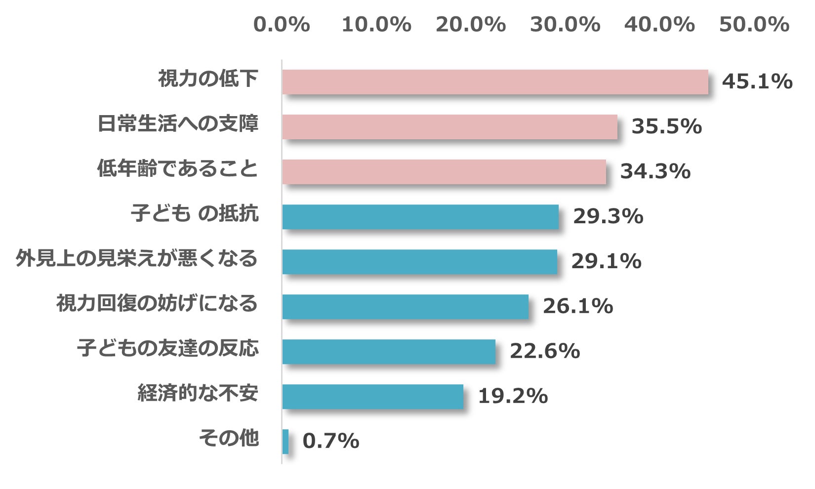 また、子どものメガネデビューに不安があったと回答した574名を対象に、どのような不安があったか質問したところ、最多回答は「視力の低下(45.1%)」、次に「日常生活への支障(35.5%)」、「低年齢であること(34.3%)」と続きました。