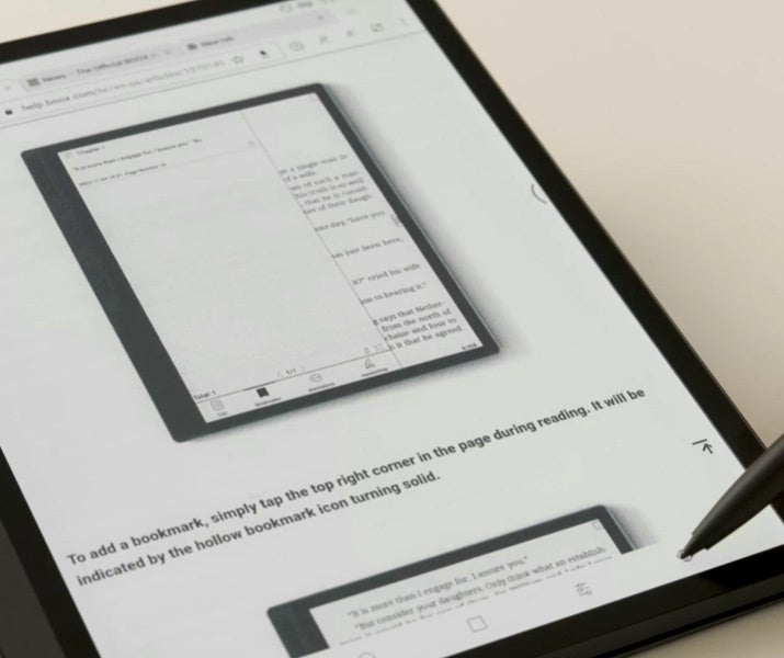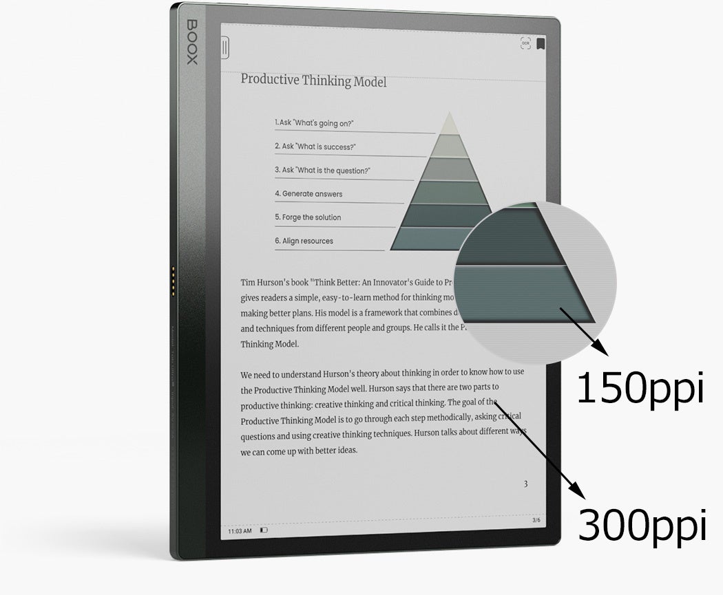 Kaleido 3スクリーンは、最新のE Ink電子ペーパーカラースクリーンです。このスクリーンは、通常のEInkパネルよりも高リフレッシュレートを実現し、カラーによる落ち着いた色合いを表現することができます。文字の中心となる白黒コンテンツは高解像度の300ppiで表示されるため明瞭なコントラストが実現。図や絵などで使用するカラーは150ppiで表示できるので、コンテンツをより楽しむことができます。