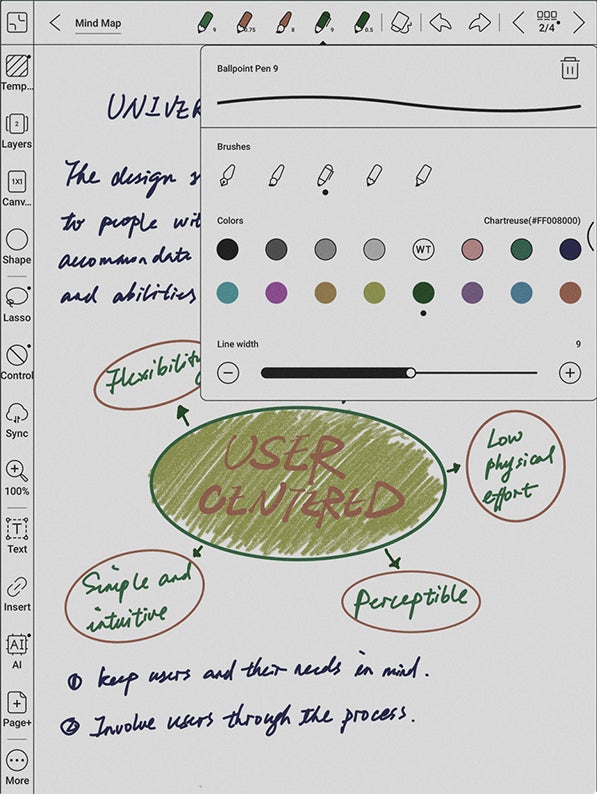 Notesは、メモアプリとなります。4096段階の筆圧検知可能な消しゴム機能付きペンが使用できるので、普段お使いの一般的な紙とペンから置き換えることができます。様々なテンプレートや柔軟なキャンバス、投げ縄ツール、同期機能、テキストボックス、添付ファイル、テキスト変換、ページ追加、その他設定などがあります。