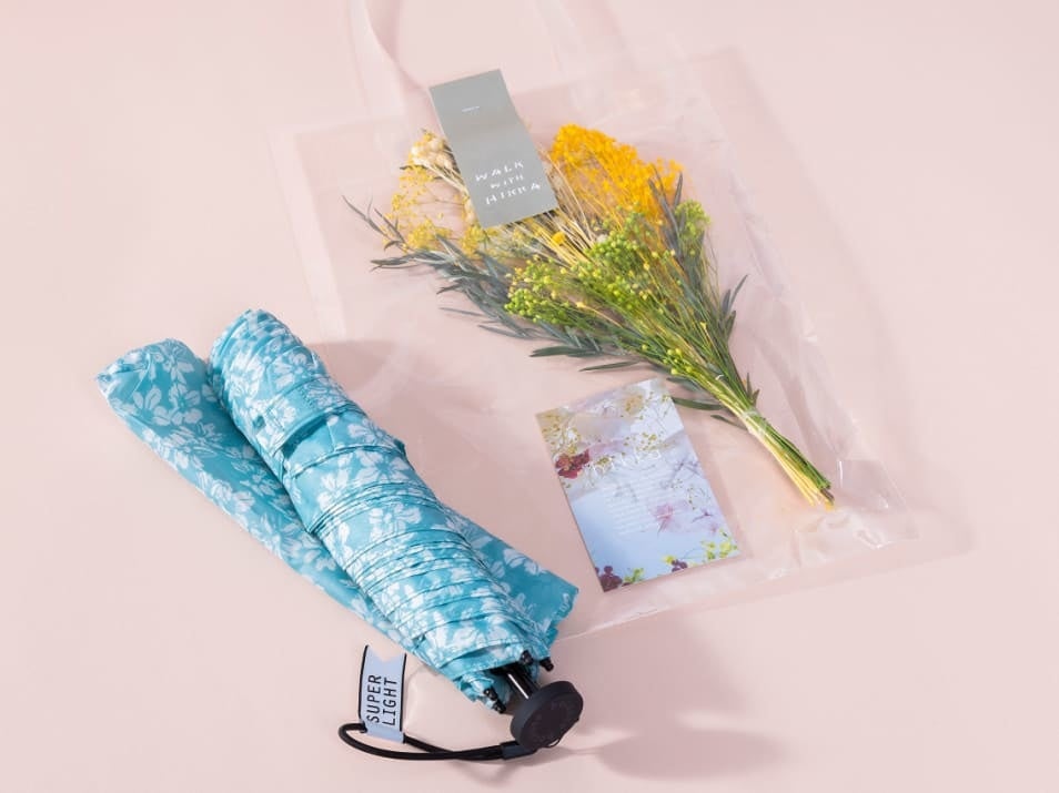 雨の日も晴れの日も素敵な日常を彩るウェザーグッズを提案する「because(ビコーズ)」の折りたたみ傘と、そのままお渡しして、そのまま飾れるブーケトートのギフトセットです。軽くて丈夫なカーボン素材、極細繊維を織り上げた軽量生地でわずか90グラムに仕上げられた持ち運びに便利な軽量傘と、デザイナーが手作業で仕上げた「美しさが長く続く」ブーケは、これからの季節を晴れやかな気持ちで過ごすためのギフトとしておすすめです。