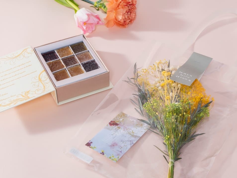 パリジャン・パリジェンヌに愛され続け「お菓子の宝石」とも称される伝統菓子「パート・ドゥ・フリュイ」と、ひとりひとりの飛躍を願うお花のプロダクトブランド「hikka(ヒッカ)」の持ち歩きたくなるブーケトートが1つになったギフトセットです。調理前原材料の総重量50%相当をフルーツが占める濃厚なフルーツゼリーと、長く楽しめるドライフラワー・プリザーブドフラワーのセットは「思い出に残る」華やかな母の日を演出します。