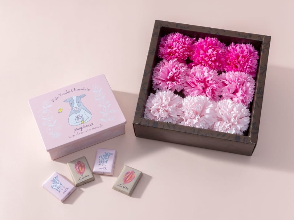 フェアトレード専門店ブランド「ピープルツリー」の限定チョコレートと、捨てないフラワーギフト「カーネーション バスフレグランス」のギフトセットです。愛らしいイラスト缶に詰め込まれたミルク味とビター味のチョコレートと、お客様の声から生まれた「使って終われる」フラワー入浴剤のセットは、感謝の気持ちと共にひとときの甘い癒しの時間を贈ることができます。