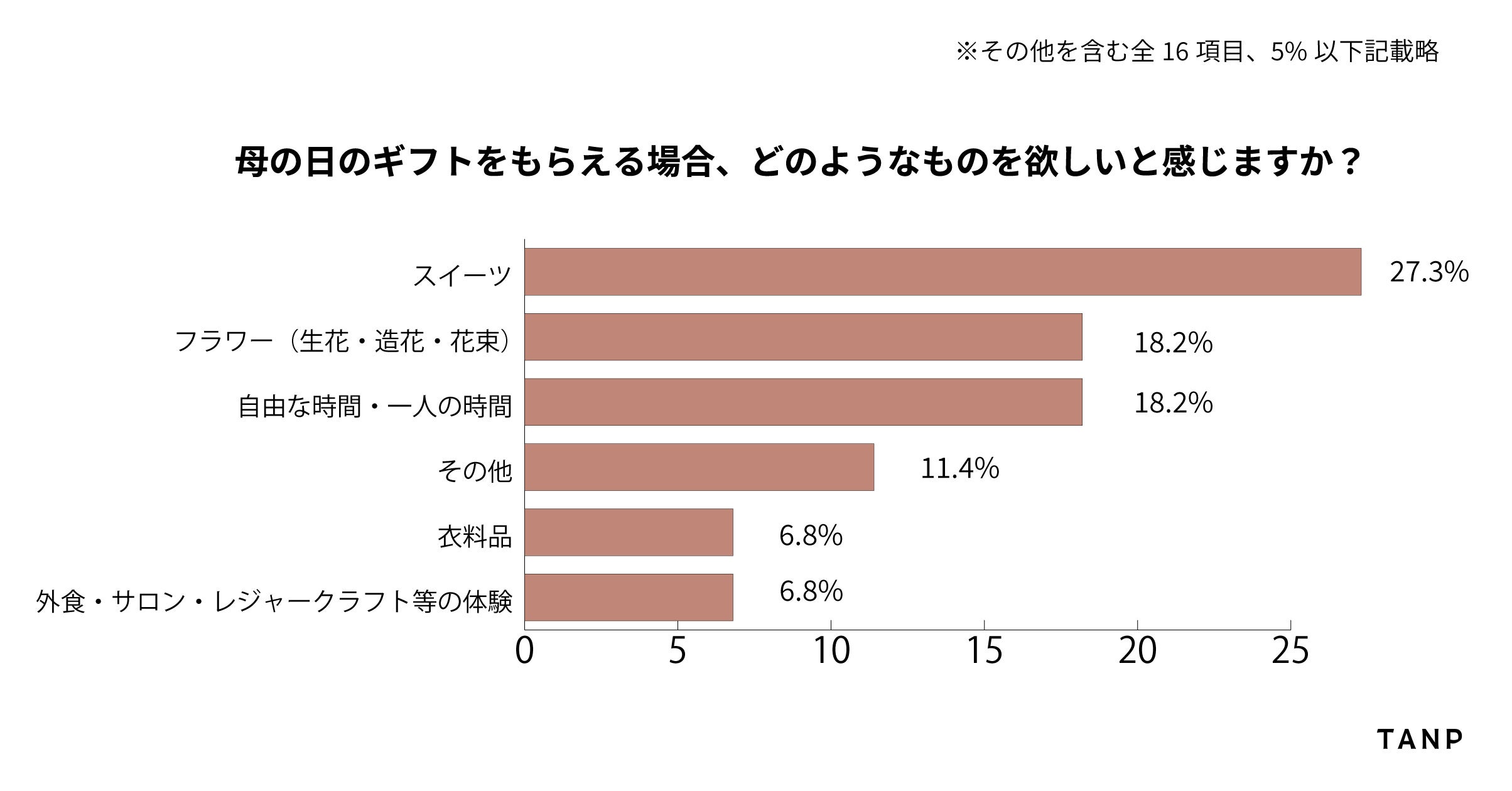 母の日のギフトを「もらったことがない・イベントに興味がない」と回答した44名に「どのようなギフトであれば嬉しいと感じるか」を問う設問では、上記同様に「フラワー製品(生花・造花・花束)」「スイーツ」の人気が高いものの、ギフトを「もらったことがある」回答者と比較すると「自由な時間・一人の時間」を選択する方が多い傾向にありました。