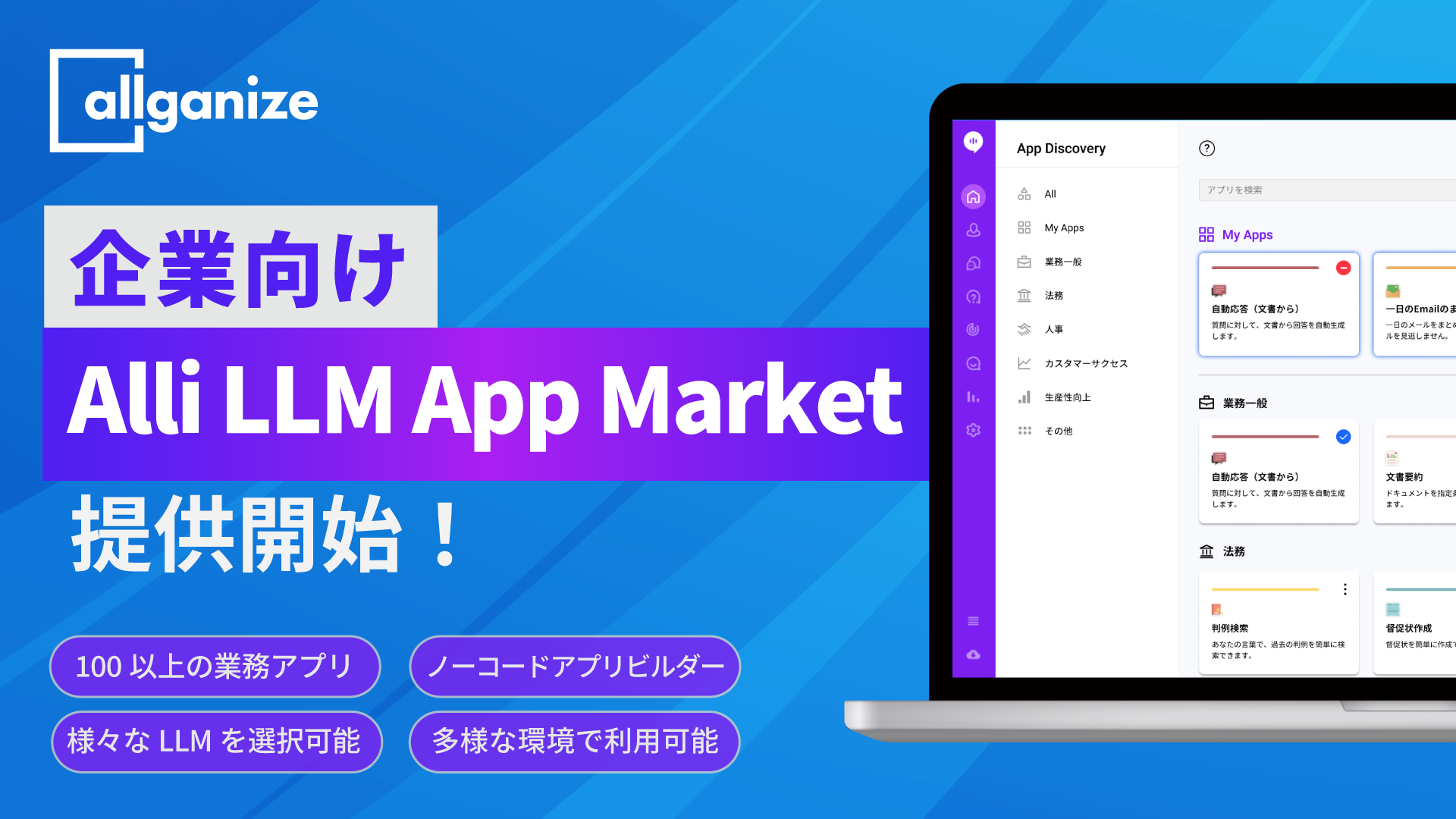 Allganize、企業向け「Alli LLM App Market」提供開始。100を超えるLLMアプリから業務に適したアプリを選択し、業務自動化に即時活用。自社アプリ作成や自社内データ連携も可能。