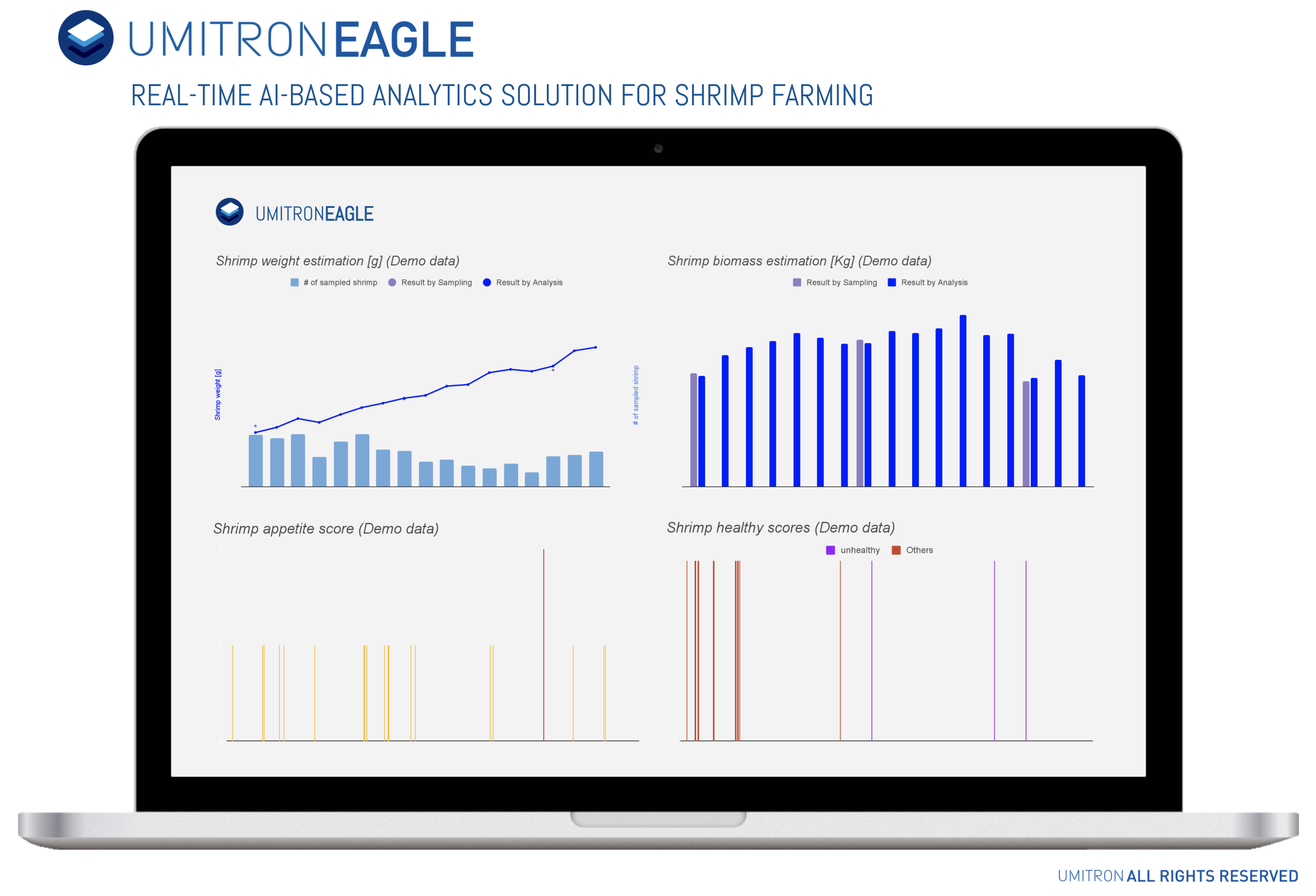 「UMITRON EAGLE」は、世界初のエビ養殖向けリアルタイムAI分析ソリューションです。エビ養殖の生育環境は水の透明度が低く、これまでエビの状態をリアルタイムに分析するといったDX技術の導入は、魚類に比べても進んでいませんでした。「UMITRON EAGLE」は、高度なAI技術により、水の透明度が低くかつ集約的なエビ養殖の生産環境において、エビの食欲、大きさ、生物量、健康状態といった複数の生育状況データをリアルタイムに取得し分析することができます。ウミトロンでは、現在世界最大のエビ養殖事業者であるチャルーンポーカパンフーズ(CPF)社と提携しており、今後は東南アジアやインド、中国などでの拡大を図っていきます。