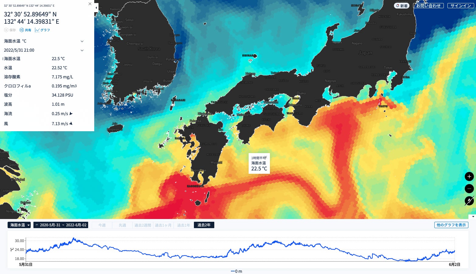「UMITRON PULSE」は、衛星リモートセンシング 技術を活用し、世界中の様々なエリアの高解像度の海洋データを取得できるプラットフォームです。魚類養殖、及び貝類養殖、海藻類の養殖事業者にとって、海洋環境の変化は、給餌や採苗、出荷の時期等に関して大きな影響を与え、かつ有害なプランクトン繁殖等のリスクとなる場合があります。「UMITRON PULSE」によって、海水温、塩分、溶存酸素、クロロフィル濃度、波高、風、海流といった海洋データを提供しております。また、当日付の海洋データだけではなく、過去2年分の履歴データや未来48時間以内の予測データも提供しており、対局的かつ長期的なリスク分析にも活用可能です。「UMITRON PULSE」は欧州、東南アジア、北中南米、オセアニア等、既に世界20カ国以上で活用されておりますが、今後は長期データを活用したビックデータ解析等のテーマで連携できるグローバルなパートナーの開拓を進めていきます。