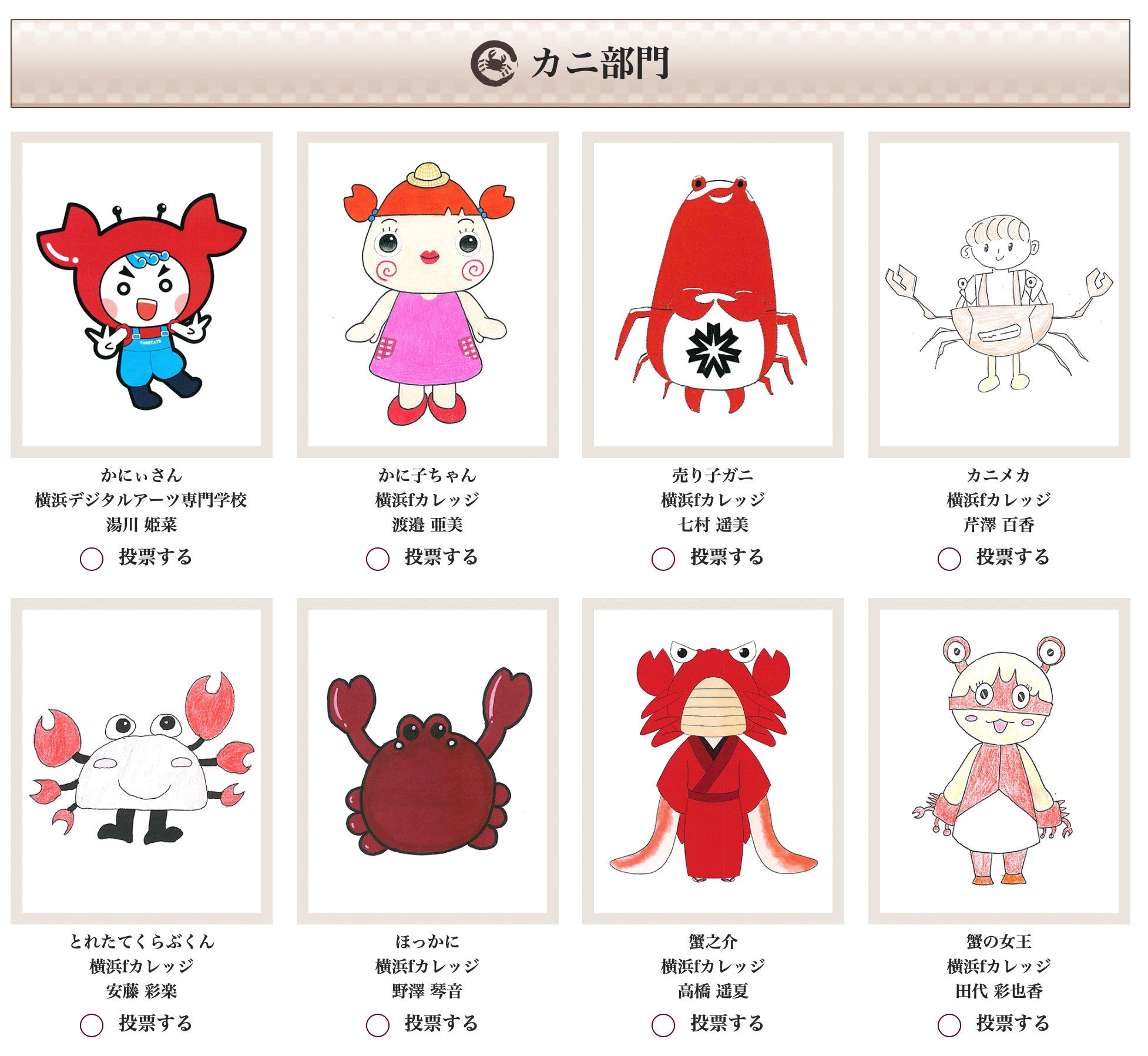 「カニ部門」「うし部門」「その他部門」の3部門から、それぞれお気に入りの作品を1つ選び投票できます。