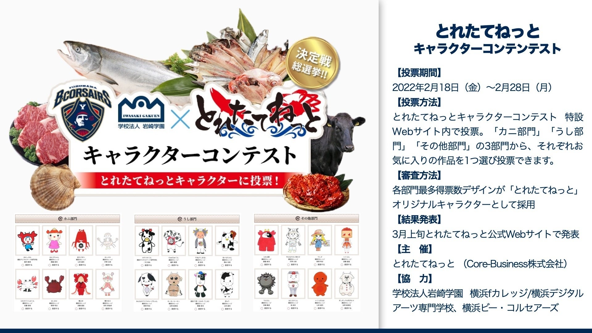 岩崎学園はBリーグ 2021-22 シーズン 横浜ビー・コルセアーズ オフィシャルパートナーであり、また、「とれたてねっと」はBリーグ 2021-22シーズン 横浜ビー・コルセアーズ オフィシャルパートナーのCore-Business株式会社が運営する、カニ・牡蠣・海産物とブランド牛を中心としたお取り寄せの通信販売 サイトです。この「とれたてねっと」オリジナルキャラクターのデザイン候補作品を、岩崎学園 横浜fカレッジ及び横浜デジタルアーツ専門学校の学生がデザインし、特設Webサイト上での一般投票によって「とれたてねっと」のオリジナルキャラクターが決定します。投票は横浜ビー・コルセアーズのファン・ブースターにも参加を促し、横浜ビー・コルセアーズ所属選手やチアリーダーズを活用したプロモーションも行う予定です。