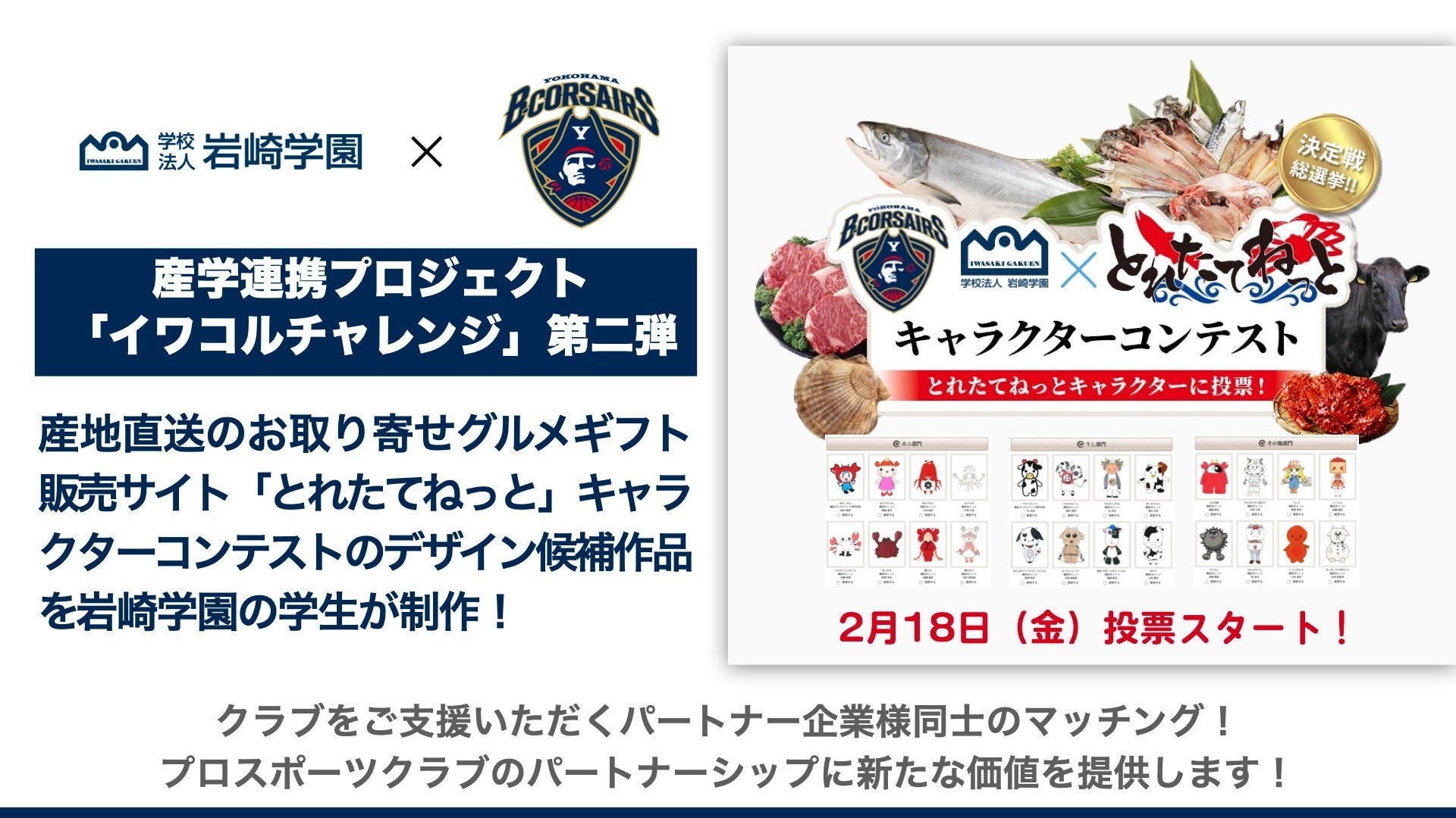 このたび、横浜ビー・コルセアーズでは、オフィシャルパートナーである学校法人岩崎学園(以下、岩崎学園)との産学連携の取り組み「イワコルチャレンジ」 第二弾として、同じくオフィシャルパートナーのCore-Business株式会社が運営するグルメギフト販売 サイト「とれたてねっと」のキャラクターコンテストを、「イワコルチャレンジ」プロジェクトの一環としてサポートさせていただくことになりました。