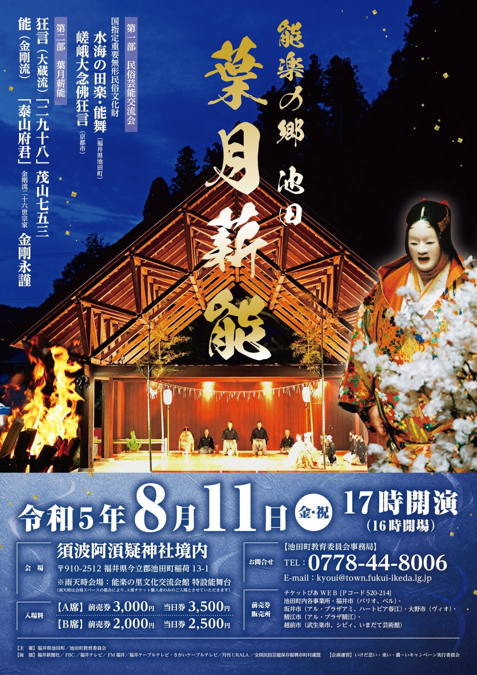 福井県池田町では、令和5年8月11日(金・祝)須波阿湏疑神社境内にて「葉月薪能」を開催します。能文化が根ざす池田町で幽玄の舞をお楽しみください。