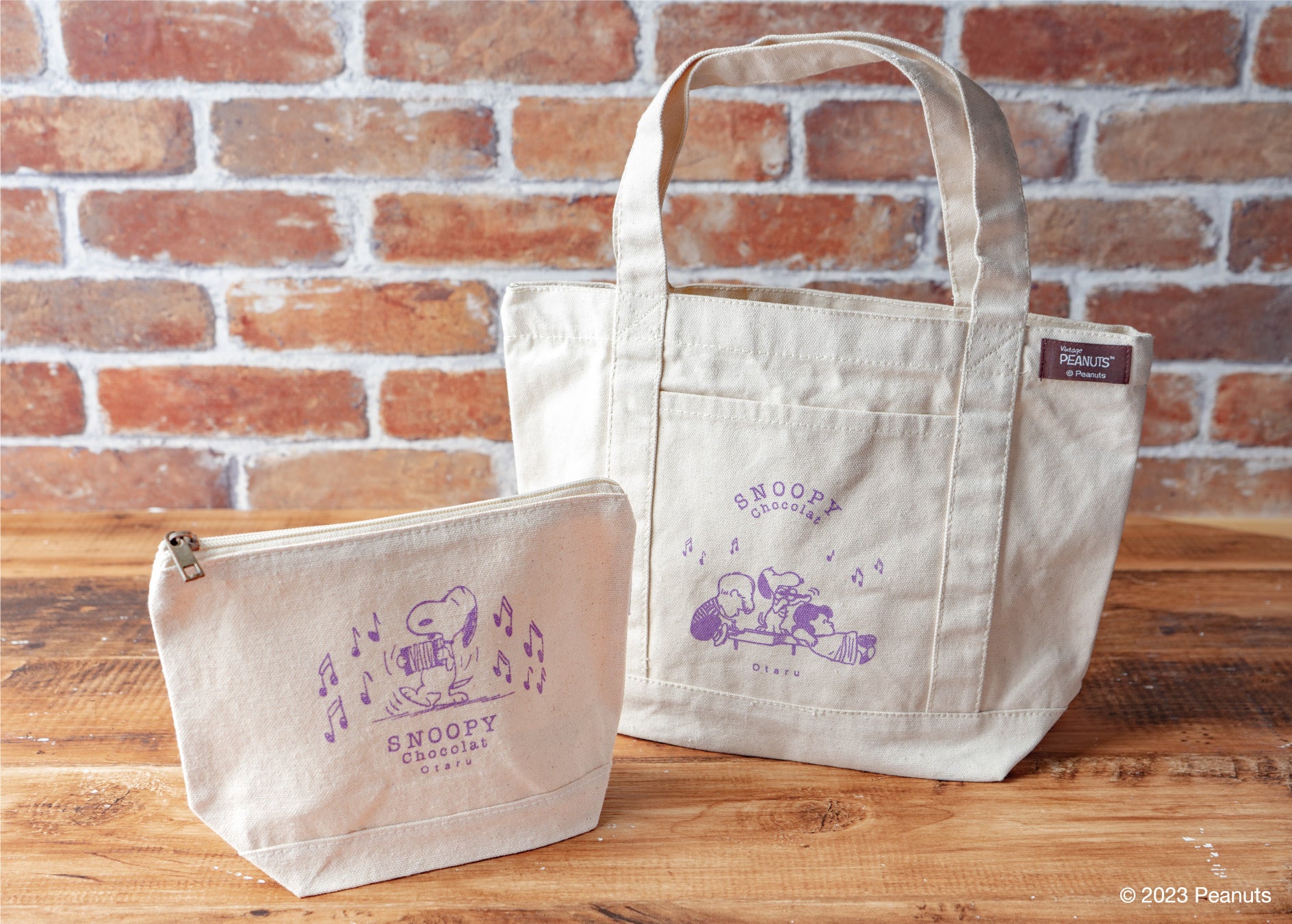 音楽を楽しむスヌーピーたちのデザインが可愛い、ちょっとしたお出かけに便利なポケット付きのミニトートと、旅行中の小物もすっきりまとめられる大きめ待ち付きポーチです。