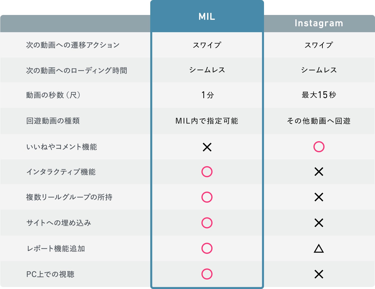 ■「MIL」リール機能の主な特徴(Instagramとの比較より)