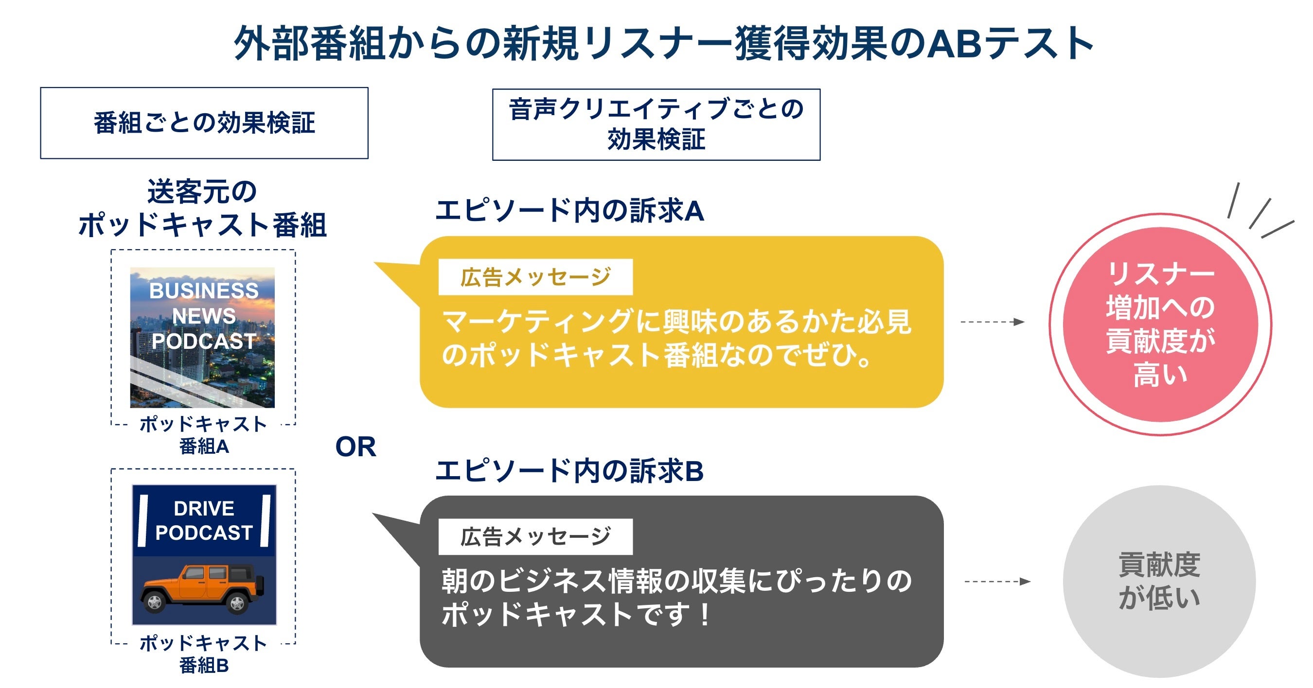 外部ポッドキャスト広告上で訴求する番組紹介のメッセージや音声CMを定期的に変更し、その期間における集客のパフォーマンスを測ることで、もっとも効果のある訴求メッセージ・音声CMの発見やその改善に役立ちます。