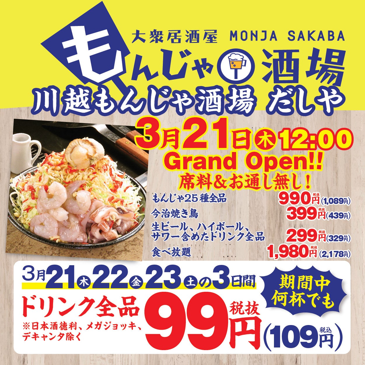 さらに、オープンを記念して3月21日(木)から23日(土)までの3日間限定で、ドリンク全品を99円(税抜/109円税込)で提供する特別キャンペーンを行います。この期間中は、多くのお客様に「川越もんじゃ酒場だしや」を体験していただくため特別価格でご案内いたします。