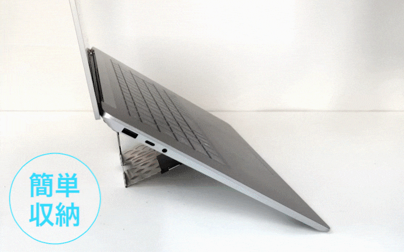 付属のすべり止めパッドをノートパソコンに貼りつける事によりズレを防止し、擦り傷や落下などから保護できます。またスタンドを折り畳んだ状態でも安定した作業が可能です。