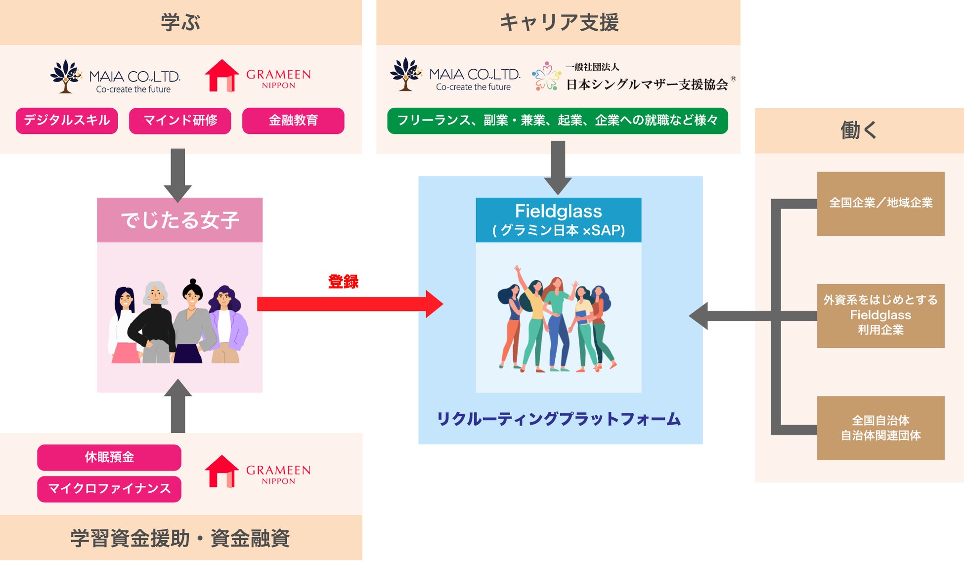 株式会社MAIA(本社:東京都港区、代表取締役:月田有香、以下「MAIA」)と一般社団法人グラミン日本(所在地:東京都中央区、理事長:百野公裕、以下「グラミン日本」)と一般社団法人日本シングルマザー支援協会(本社:神奈川県横浜市、代表理事:江成道子、以下「日本シングルマザー支援協会」)は、コロナ禍で生活困窮に追いやられているシングルマザーをはじめとした女性にむけ、マイクロファイナンスによる教育費用、デジタル・ビジネススキル研修、就労・キャリア支援を一貫して提供するプログラム『でじたる女子』を5月11日(水)より新たに実施、受講生募集を開始する運びとなりましたので、お知らせいたします。