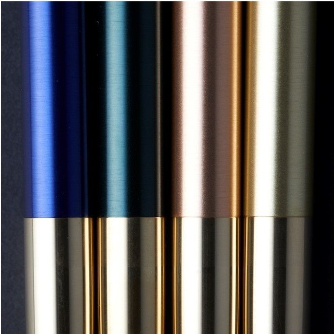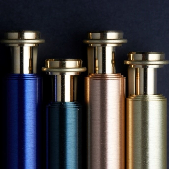 今回は「自由を、奏でよう」をテーマに開発した、シリーズ初のノック式ボールペンとなります。ノック部分は管楽器のピストンバルブを思わせるデザインを採用し、ボディにはアルマイト染色による表情豊かなアルミ軸と真鍮製のグリップを取り入れるなど、細部までこだわった商品です。